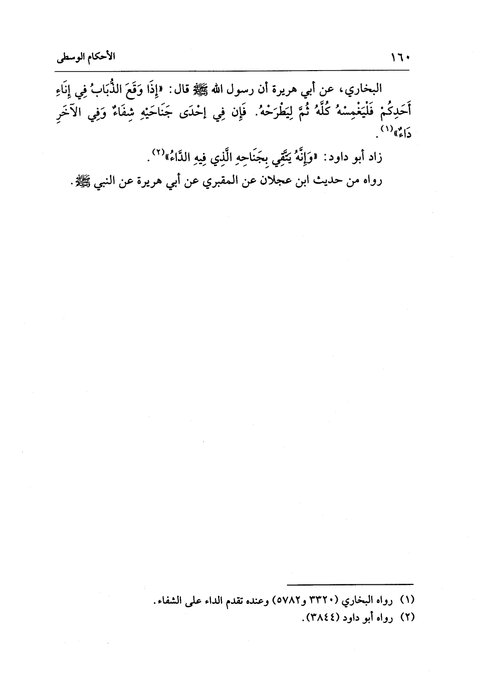 البخاري، عن أبي هريرة أن رسول الله - صلى الله عليه وسلم - قال: "إِذَا وَقَعَ الذُّبَابُ فِي إِنَاءِ أَحَدِكُمْ فَلْيَغْمِسْهُ كُلَّهُ ثُمَّ لِيَطْرَحْهُ. فَإِن فِي إحْدَى جَنَاحَيْهِ شِفَاءٌ وَفِي الآخَرِ دَاءٌ" (¬1).