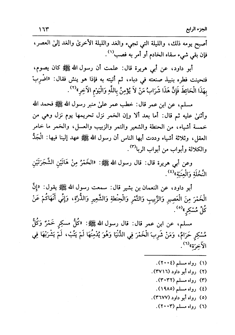 أبو داود، عن النعمان بن بشير قال: سمعت رسول الله - صلى الله عليه وسلم - يقول: "إِنَّ الْخَمْرَ مِنَ الْعَصِيرِ وَالزَّبِيبِ وَالتَّمْرِ وَالْحِنْطةِ وَالشَّعِيرِ وَالذُّرَّةِ، وَإِنِّي أَنْهَاكُمْ عَنْ كُلِّ مُسْكِرٍ" (¬5).