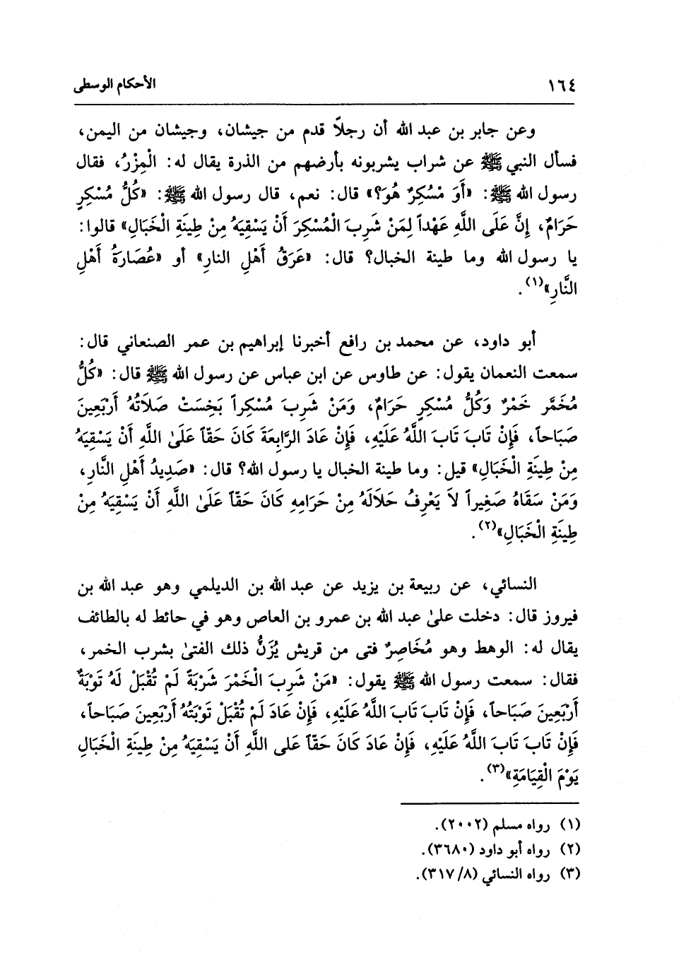 أبو داود، عن محمد بن رافع أخبرنا إبراهيم بن عمر الصنعاني قال: سمعت النعمان يقول: عن طاوس عن ابن عباس عن رسول الله - صلى الله عليه وسلم - قال: "كُلُّ مُخَمَّر خَمْرٌ وَكُلُّ مُسْكِرٍ حَرَامٌ، وَمَنْ شَرِبَ مُسْكِرًا بَخِسَتْ صَلاَتُهُ أَربعِينَ صَبَاحًا، فَإِنْ تَابَ تَابَ اللهُ عَلَيْهِ، فَإِنْ عَادَ الرَّابِعَةَ كَانَ حَقًّا عَلَى اللهِ أَنْ يَسْقِيَهُ مِنْ طِينَةِ الْخَبَالِ" قيل: وما طينة الخبال يا رسول الله؟ قال: "صَدِيدُ أَهْلِ النَّارِ، وَمَنْ سَقَاهُ صَغِيرًا لاَ يَعْرِفُ حَلاَلَهُ مِنْ حَرَامِهِ كَانَ حَقًّا عَلَى اللهِ أَنْ يَسْقِيَهُ مِنْ طِينَةِ الْخَبَالِ" (¬2).