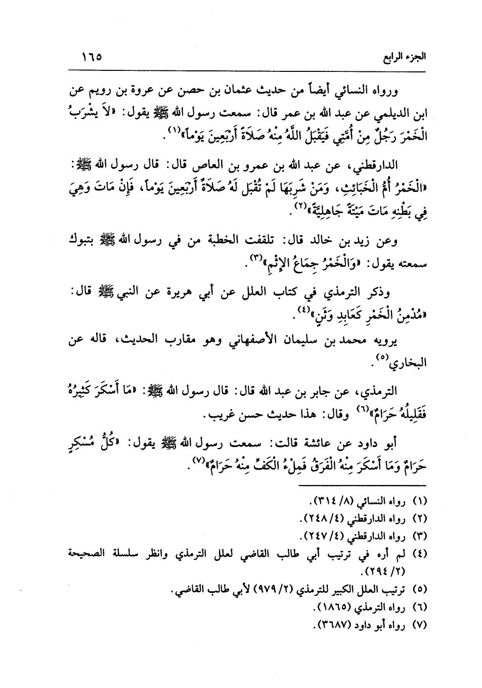 الدارقطني، عن عبد الله بن عمرو بن العاص قال: قال رسول الله - صلى الله عليه وسلم -: "الْخَمْرُ أُمُّ الْخَبَائِثِ، وَمَنْ شَرِبَهَا لَمْ تُقْبَل لَهُ صَلاَةٌ أَربعِينَ يَوْمًا، فَإِنْ مَاتَ وَهِيَ فِي بَطْنِهِ مَاتَ مَيْتَةً جَاهِلِيَّةً" (¬2).