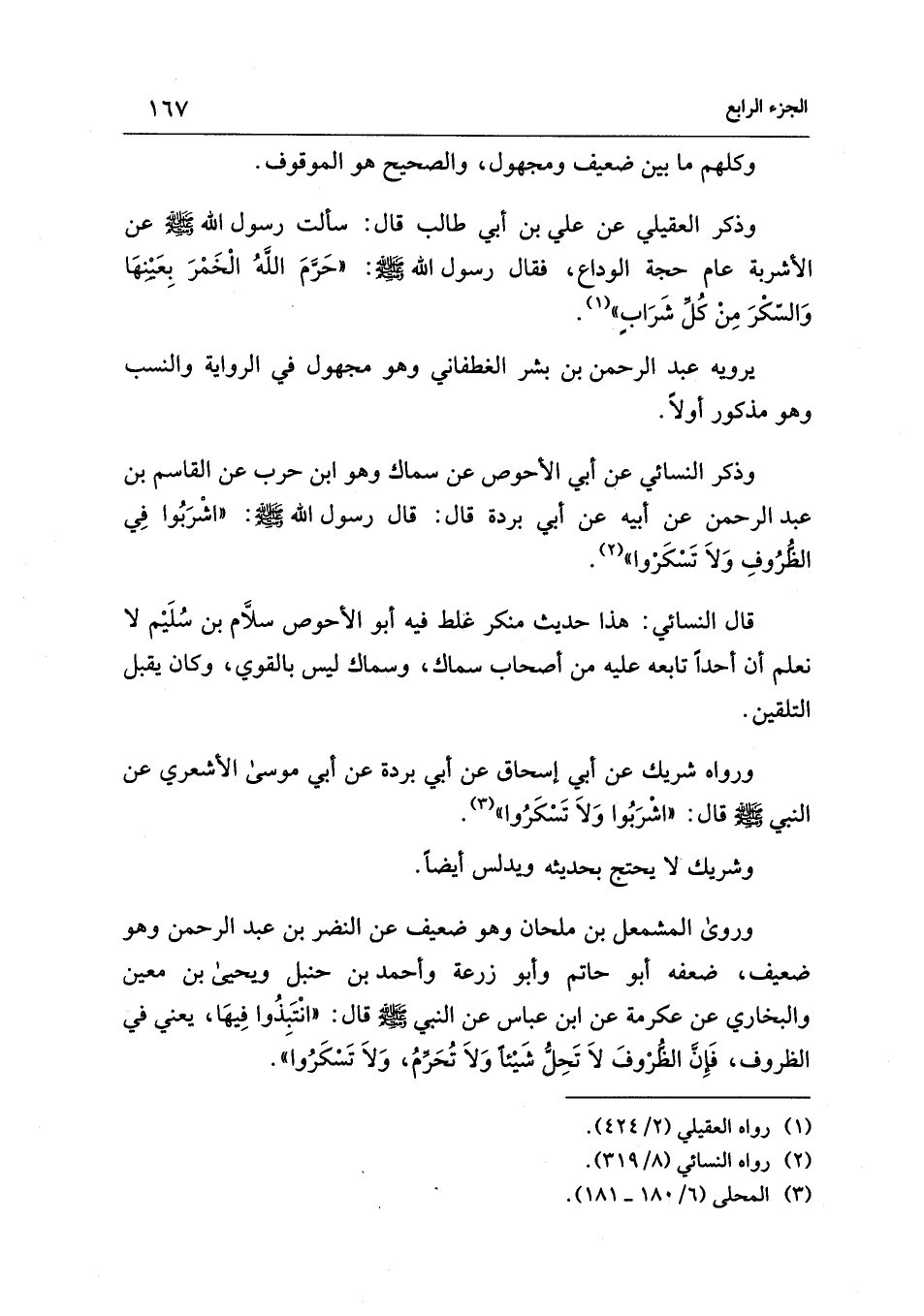 ورواه شريك عن أبي إسحاق عن أبي بردة عن أبي موسى الأشعري عن النبي - صلى الله عليه وسلم - قال: "اشْرَبُوا وَلاَ تَسْكَرُوا" (¬3).