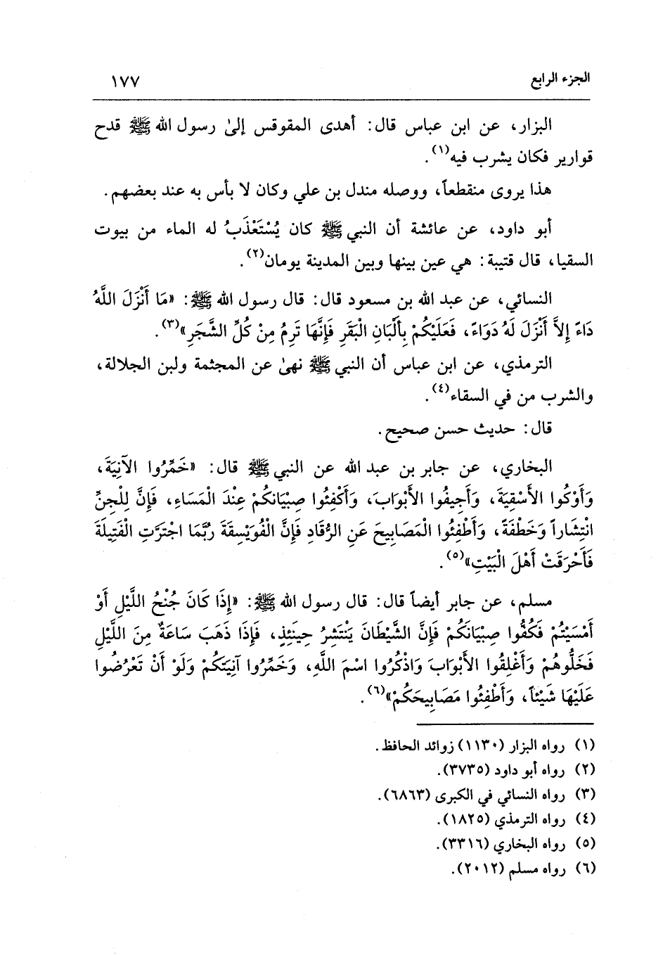 البخاري، عن جابر بن عبد الله عن النبي - صلى الله عليه وسلم - قال: "خَمِّرُوا الآنِيَةَ، وَأَوْكُوا الأَسْقِيَةَ، وَأَجِيفُوا الأَبْوَابَ، وَأَكْفِئُوا صِبْيَانكُمْ عِنْدَ الْمَسَاءِ، فَإِنَّ لِلْجِنِّ انْتِشَارًا وَخَطْفَةً، وَأَطْفِئُوا الْمَصَابِيحَ عَنِ الرُّقَادِ فَإِنَّ الْفُوَيْسِقَةَ رْبَّمَا اجْترَّتِ الْفَتِيلَةَ فَأَحْرَقَتْ أَهْلَ الْبَيْتِ" (¬5).