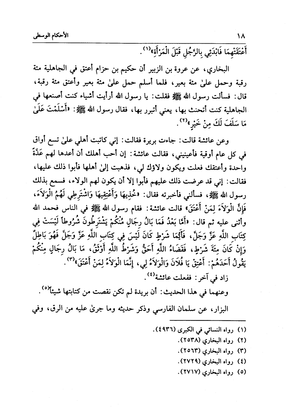 وعن عائشة قالت: جاءت بريرة فقالت: إني كاتبت أهلي على تسع أواق في كل عام أوقية فأعينيني، فقالت عائشة: إن أحب أهلك أن أعدها لهم عدَةً واحدة وأعتقك فعلت ويكون ولاؤك لي، فذهبت إلى أهلها فأبوا ذلك عليها، فقالت: إني قد عرضت ذلك عليهم فأبوا إلا أن يكون لهم الولاء، فسمع بذلك رسول الله - صلى الله عليه وسلم -، فسألني فأخبرته فقال: "خُذِيها وَأَعْتِقِيهَا وَاشْتَرِطِي لَهُمُ الْوَلاءَ، فَإنَّ الْوَلاَءَ لِمَنْ أعتَقَ" قالت عائشة: فقام رسول الله - صلى الله عليه وسلم - في الناس فحمد الله وأثنى عليه ثم قال: "أَمَّا بَعْدُ فَمَا بَالُ رِجَالٍ مُنكم يَشْتَرِطُونَ شُرُوطًا لَيْسَتْ فِي كِتَابِ اللهِ عَزَّ وَجَلَّ، فأَيُّمَا شَرطٍ كَانَ لَيْسَ فِي كِتَابِ الله عَزَّ وَجَلَّ فَهُوَ بَاطِلٌ وَإِنْ كَانَ مِئَةَ شَرْطٍ، فَقَضَاءُ اللهِ أَحَقُّ وَشرطُ اللهِ أَوْثَقُ، مَا بَالُ رِجَالٍ مِنْكم يَقُولُ أَحَدَهم: أَعتِقْ يَا فُلاَنَ وَالْوَلاَءُ لِي، إِنَّمَا الْوَلاَءُ لِمَنْ أعتَقَ" (¬3).