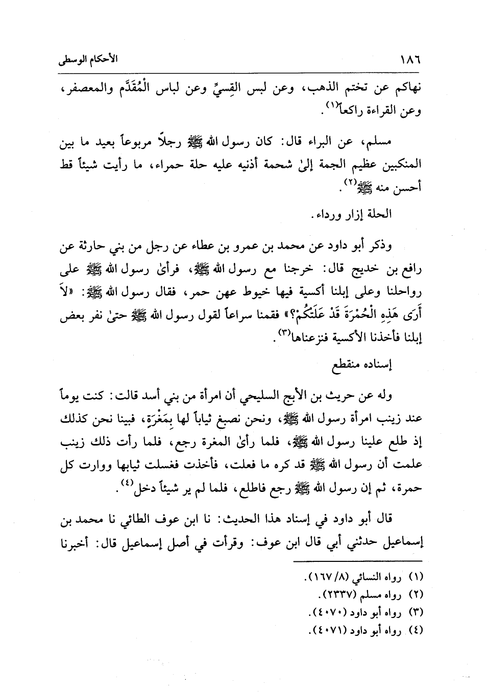 وذكر أبو داود عن محمد بن عمرو بن عطاء عن رجل من بني حارثة عن رافع بن خديج قال: خرجنا مع رسول الله - صلى الله عليه وسلم -، فرأى رسول الله - صلى الله عليه وسلم - على رواحلنا وعلى إبلنا أكسية فيها خيوط عهن حمر، فقال رسول الله - صلى الله عليه وسلم -: "لاَ أَرَى هَذهِ الْحُمْرَةَ قَدْ عَلَتْكمْ؟ " فقمنا سراعًا لقول رسول الله - صلى الله عليه وسلم - حتى نفر بعض إبلنا فأخذنا الأكسية فنزعناها (¬3).