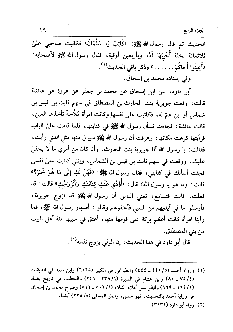 أبو داود، عن ابن إسحاق عن محمد بن جعفر عن عروة عن عائشة قالت: وقعت جويرية بنت الحارث بن المصطلق في سهم ثابت بن قيس بن