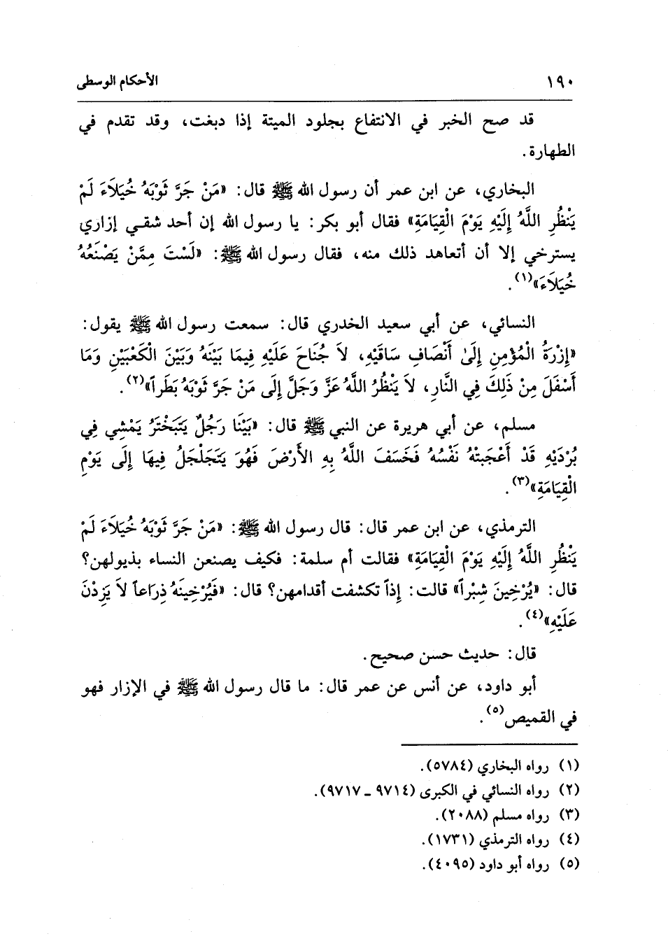 الترمذي، عن ابن عمر قال: قال رسول - صلى الله عليه وسلم -: "مَنْ جَرَّ ثَوْبَهُ خُيَلاَءَ لَمْ يَنْظُرِ اللهُ إِلَيْهِ يَوْمَ الْقِيَامَةِ" فقالت أم سلمة: فكيف يصنعن النساء بذيولهن؟ قال: "يُرْيِخنَ شِبْرًا" قالت: إِذًا تكشفت أقدامهن؟ قال: "فَيُرْخِينَهُ ذِرَاعًا لاَ يَزِدْنَ عَلَيْهِ" (¬4).