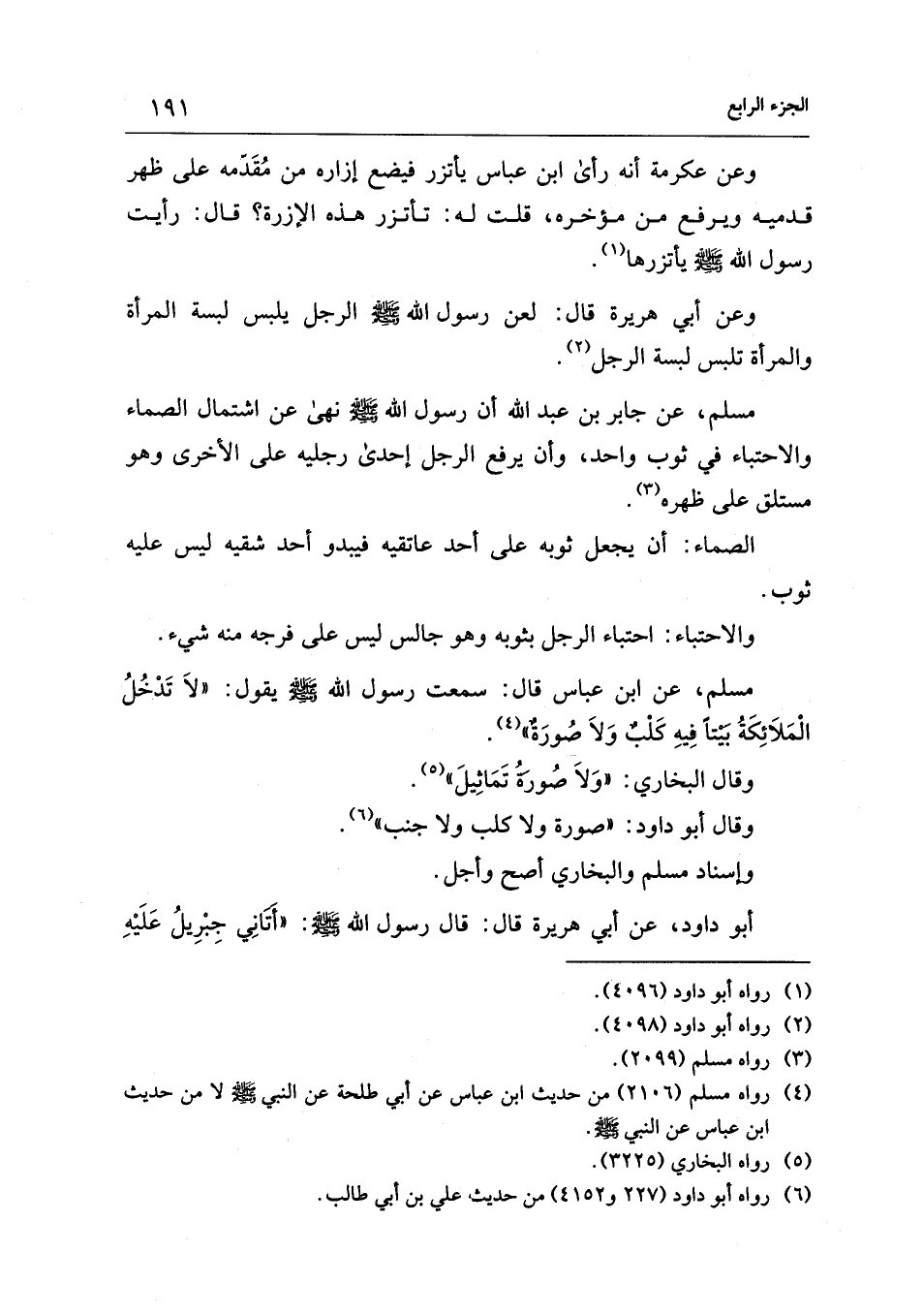 مسلم، عن ابن عباس قال: سمعت رسول الله - صلى الله عليه وسلم - يقول: "لاَ تَدْخُلُ الْمَلاَئِكَةُ بيتًا فِيهِ كلْبٌ وَلاَ صُورَةٌ" (¬4).