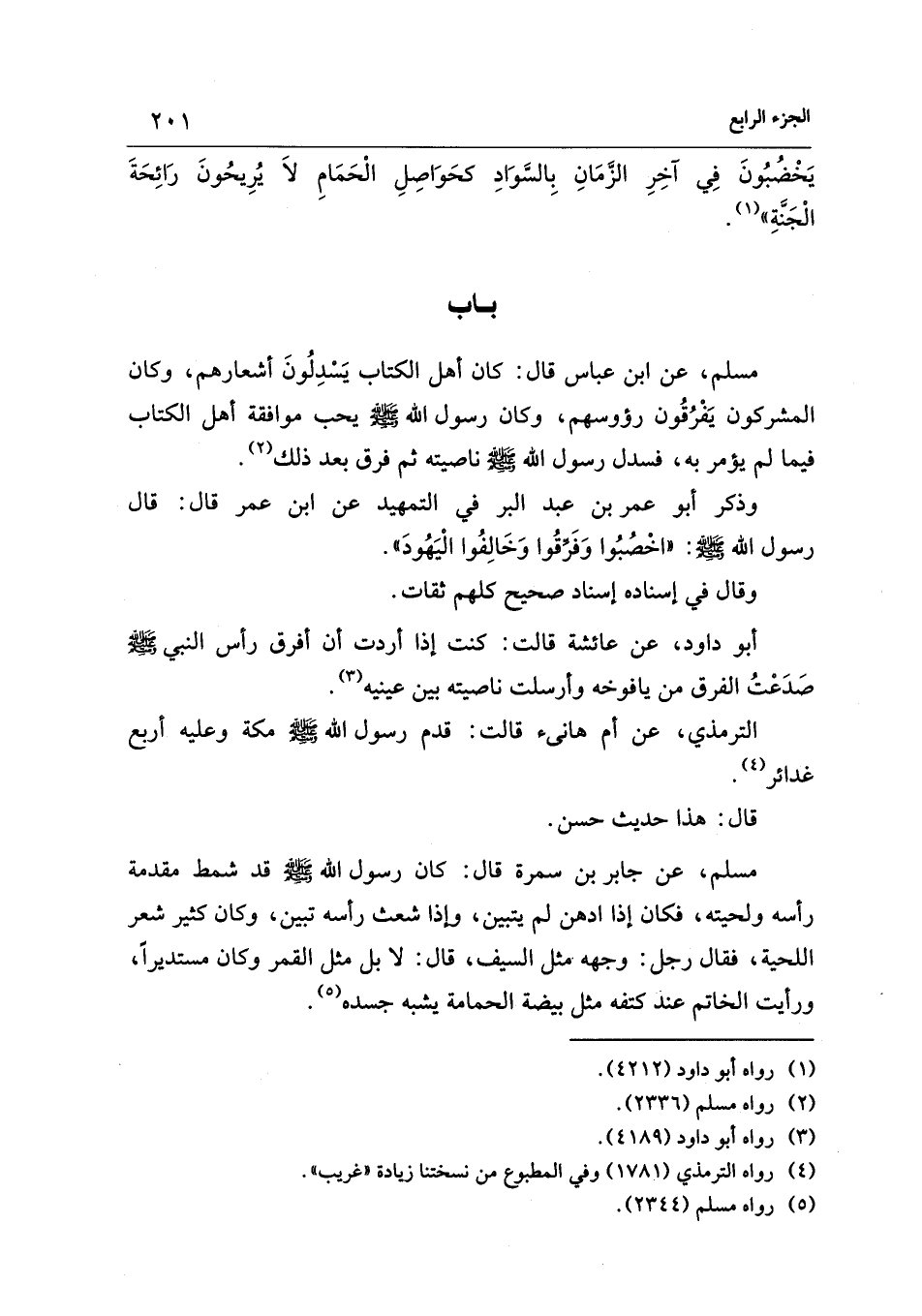 وذكر أبو عمر بن عبد البر في التمهيد عن ابن عمر قال: قال رسول الله - صلى الله عليه وسلم -: "اخْصُبُوا وَفَرِّقُوا وَخَالِفُوا الْيَهُودَ".