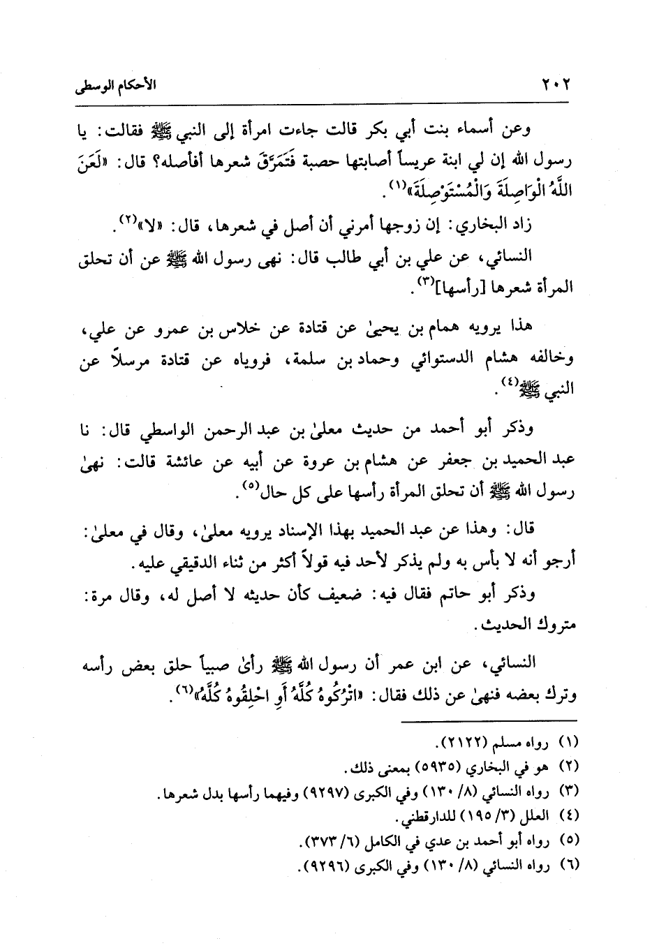 وذكر أبو أحمد من حديث معلى بن عبد الرحمن الواسطي قال: نا عبد الحميد بن جعفر عن هشام بن عروة عن أبيه عن عائشة قالت: نهى رسول الله - صلى الله عليه وسلم - أن تحلق المرأة رأسها على كل حال (¬5).