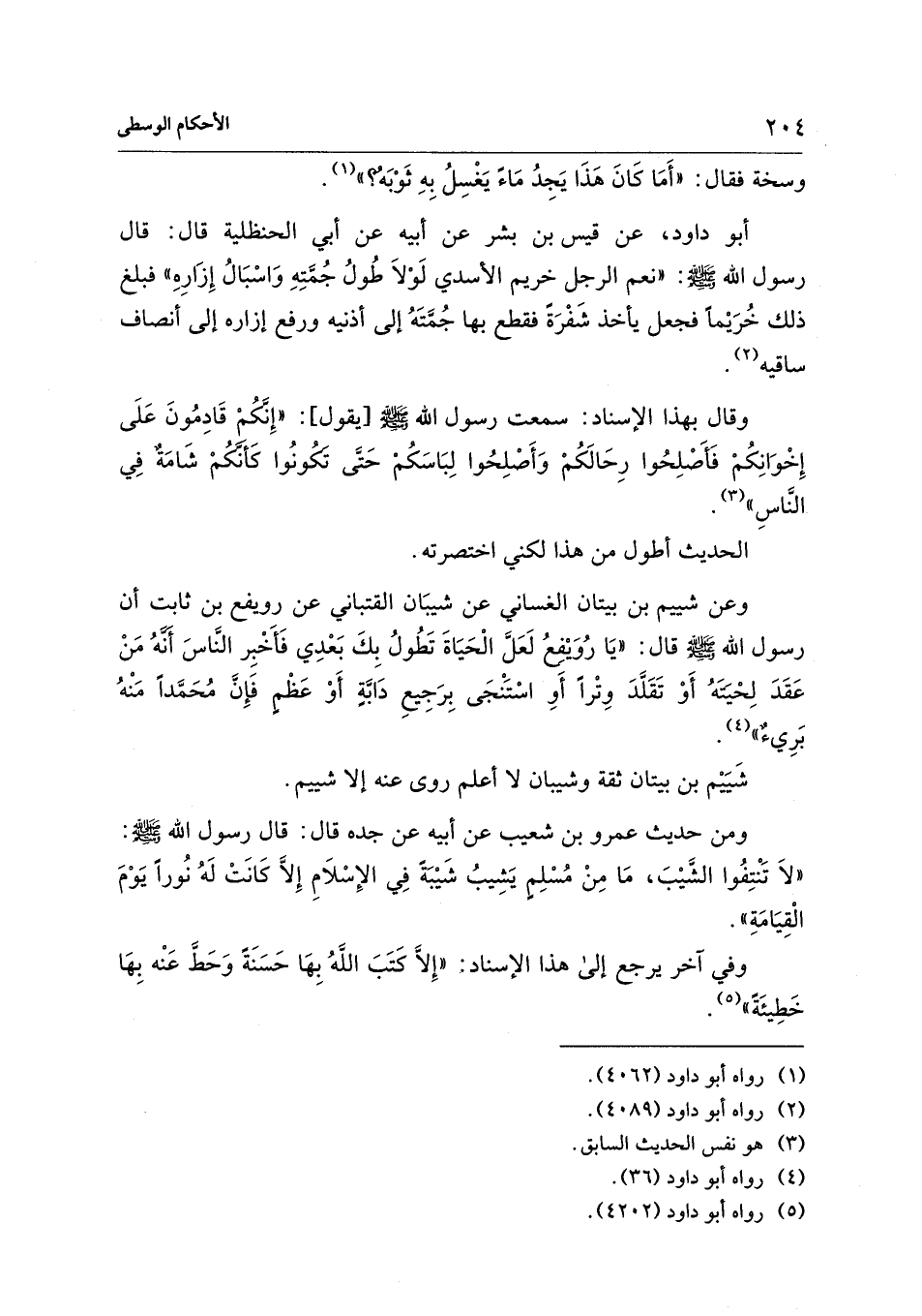 وعن شييم بن بيتان الغساني عن شيبَان القتباني عن رويفع بن ثابت أن رسول الله - صلى الله عليه وسلم - قال: "يَا رُوَيْفعُ لَعَلَّ الْحَيَاةَ تَطُولُ بِكَ بَعْدِي فَأخْبِر النَّاسَ أَنَّهُ مَنْ عَقَدَ لِحْيتهُ أَوْ تَقَلَّدَ وِتْرًا أَوِ اسْتَنْجَى بِرَجِيعِ دَابَّةٍ أَوْ عَظْم فَإِنَّ مُحَمَّدًا مَنْهُ بَرِيءٌ" (¬4).