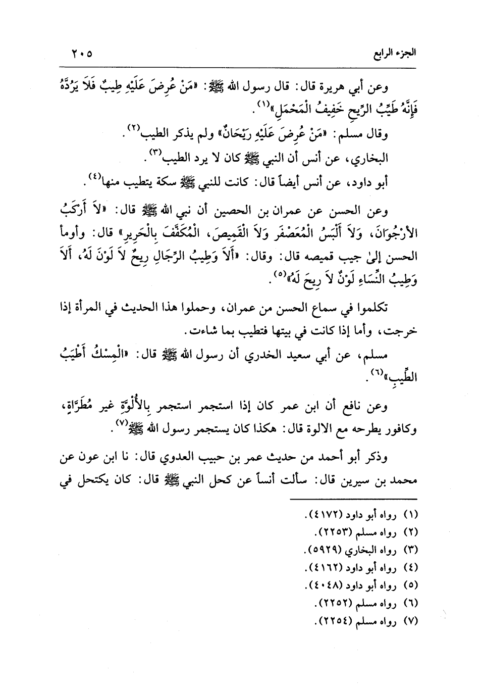وعن الحسن عن عمران بن الحصين أن نبي الله - صلى الله عليه وسلم - قال: "لاَ أَركَبُ الأرْجُوَانَ، وَلاَ أَلْبَسُ الْمُعَصْفَر وَلاَ الْقَمِيصَ، الْمُكَفَّفَ بِالْحَرِيرِ" قال: وأومأ الحسن إلى جيب قميصه قال: وقال: "أَلاَ وَطِيبُ الرِّجَالِ رِيحٌ لاَ لَوْنَ لَهُ، أَلاَ وَطِيبُ النِّسَاءِ لَوْنٌ لاَ رِيحَ لَه" (¬5).