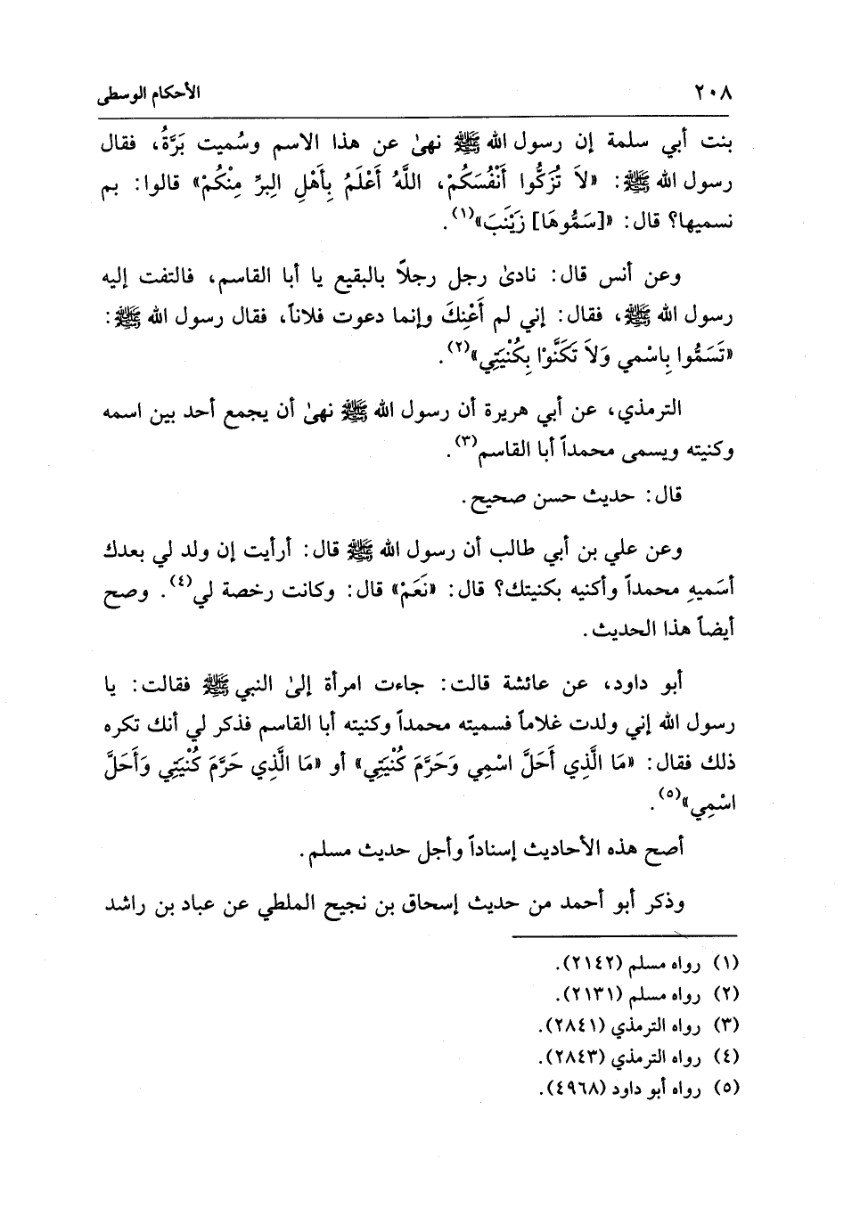 أبو داود، عن عائشة قالت: جاءت امرأة إلى النبي - صلى الله عليه وسلم - فقالت: يا رسول الله إني ولدت غلامًا فسميته محمدًا وكنيته أبا القاسم فذكر لي أنك تكره ذلك فقال: "مَا الَّذِي أَحَلَّ اسْمِي وَحَرَّمَ كُنْيَتِي" أو "مَا الَّذِي حَرَّمَ كُنْيَتِي وَأَحَلَّ اسْمِي" (¬5).
