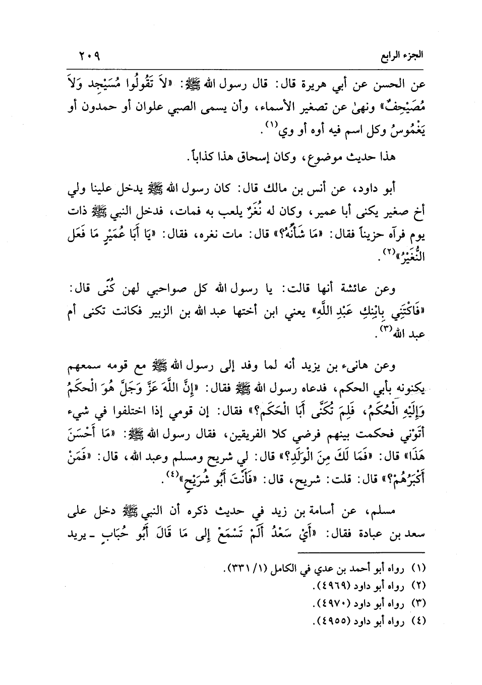 وعن هانئ بن يزيد أنه لما وفد إلى رسول الله - صلى الله عليه وسلم - مع قومه سمعهم يكنونه بأبي الحكم، فدعاه رسول الله - صلى الله عليه وسلم - فقال: "إِنَّ اللهَ عَزَّ وَجَلَّ هُوَ الْحكَمُ وإلَيْهِ الْحُكَمُ، فَلِمَ تُكَنَّى أَبَا الْحَكَم؟ " فقال: إن قومي إذا اختلفوا في شيء أتَوْني فحكمت بينهم فرضي كلا الفريقين، فقال رسول الله - صلى الله عليه وسلم -: "مَا أَحْسَنَ هَذَا" قال: "فَمَا لَكَ مِنَ الْوَلَدِ؟ " قال: لي شريح ومسلم وعبد الله، قال: "فَمَنْ أَكْبَرُهُمْ؟ " قال: قلت: شريح، قال: "فَأَنْتَ أبو شُرَيْحٍ" (¬4).