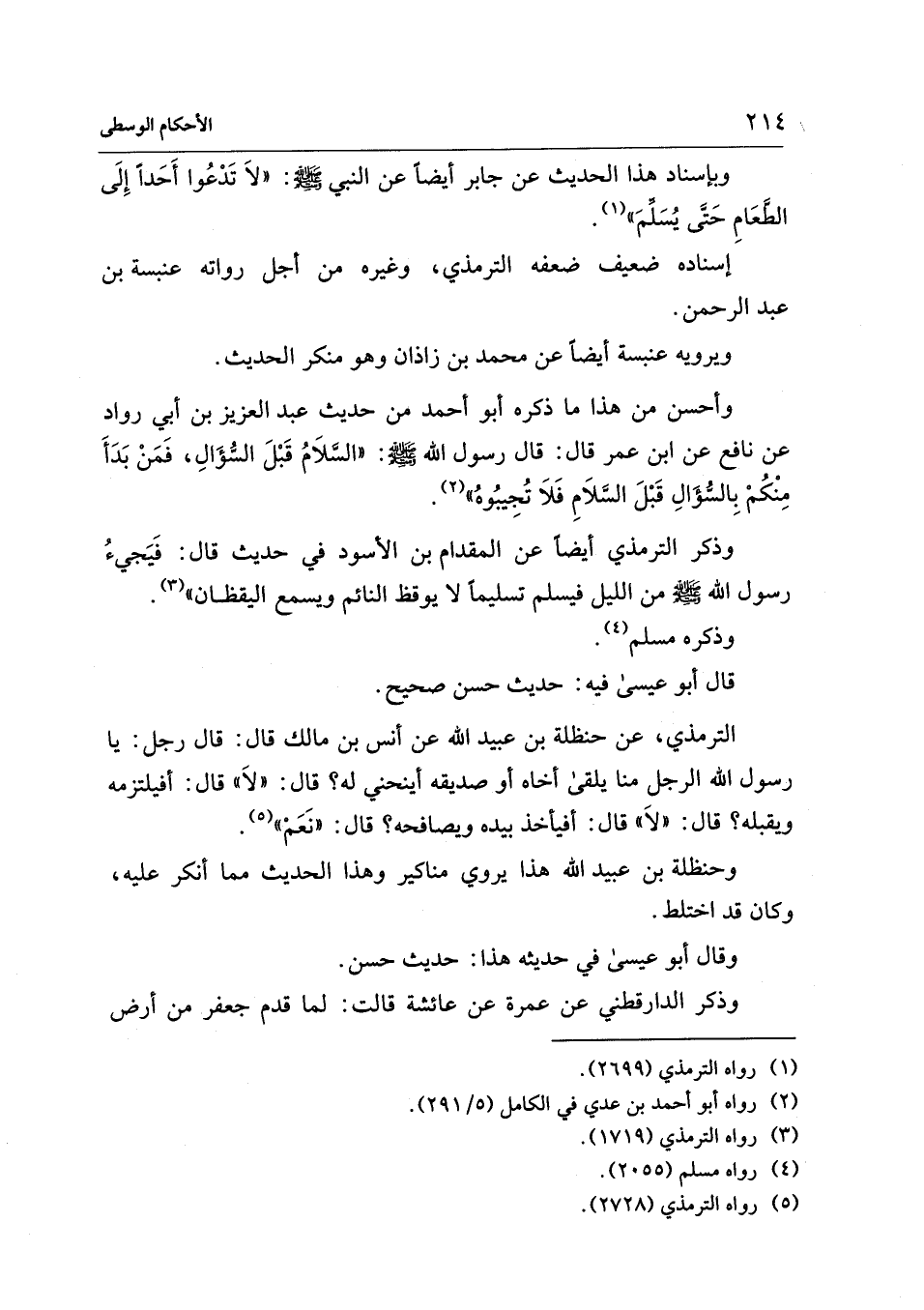 الترمذي، عن حنظلة بن عبيد الله عن أنس بن مالك قال: قال رجل: يا رسول الله الرجل منا يلقى أخاه أو صديقه أينحني له؟ قال: "لاَ" قال: أفيلتزمه ويقبله؟ قال: "لاَ" قال: أفيأخذ بيده ويصافحه؟ قال: "نَعَمْ" (¬5).