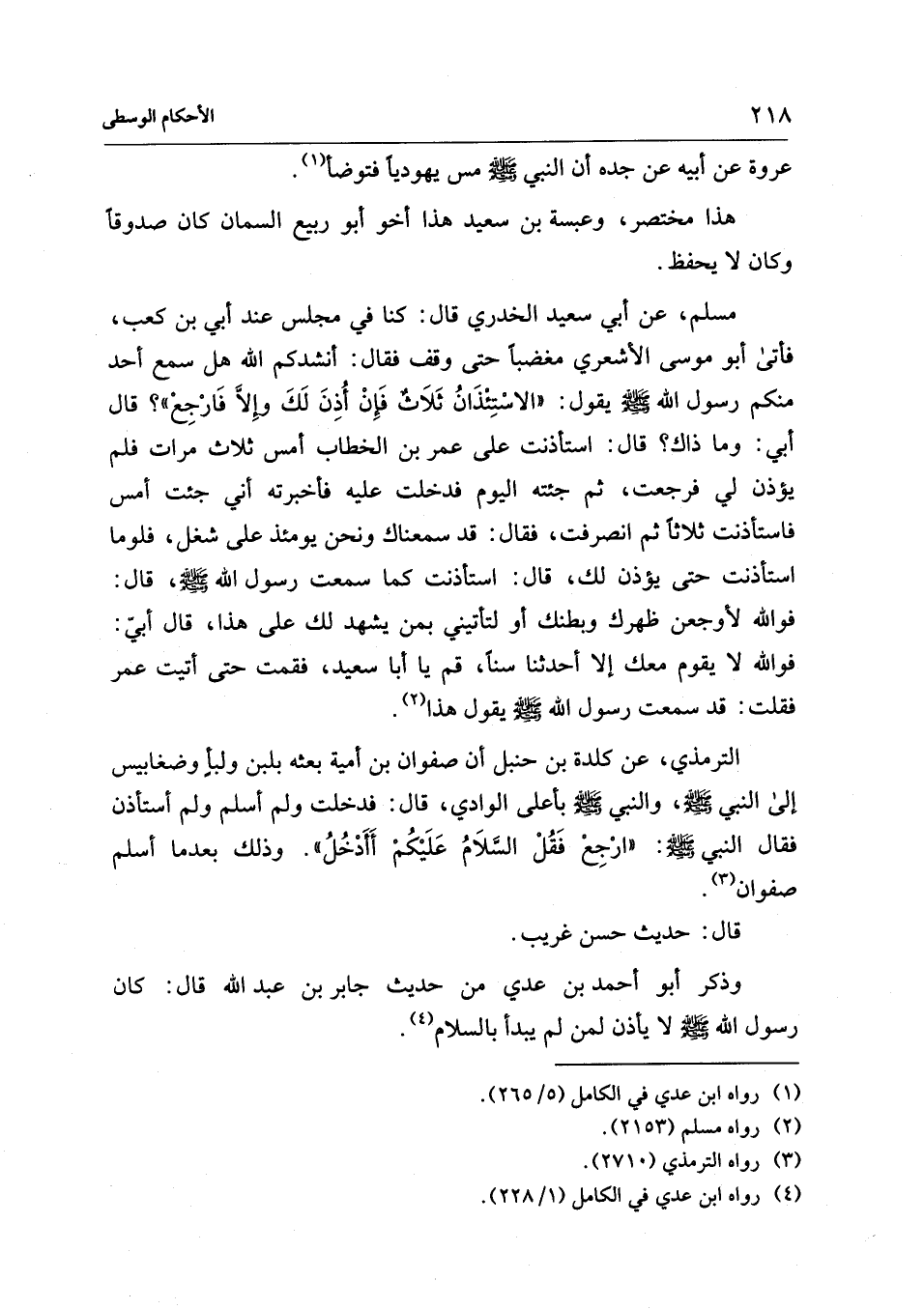 الترمذي، عن كلدة بن حنبل أن صفوان بن أمية بعثه بلبن ولبأٍ وضغابيس إلى النبي - صلى الله عليه وسلم -. والنبي - صلى الله عليه وسلم - بأعلى الوادي، قال: فدخلت ولم أسلم ولم أستأذن فقال النبي - صلى الله عليه وسلم -: "ارْجِعْ فَقُلْ السَّلاَمُ عَلَيْكُمْ أَأَدْخُلُ". وذلك بعدما أسلم صفوان (¬3).