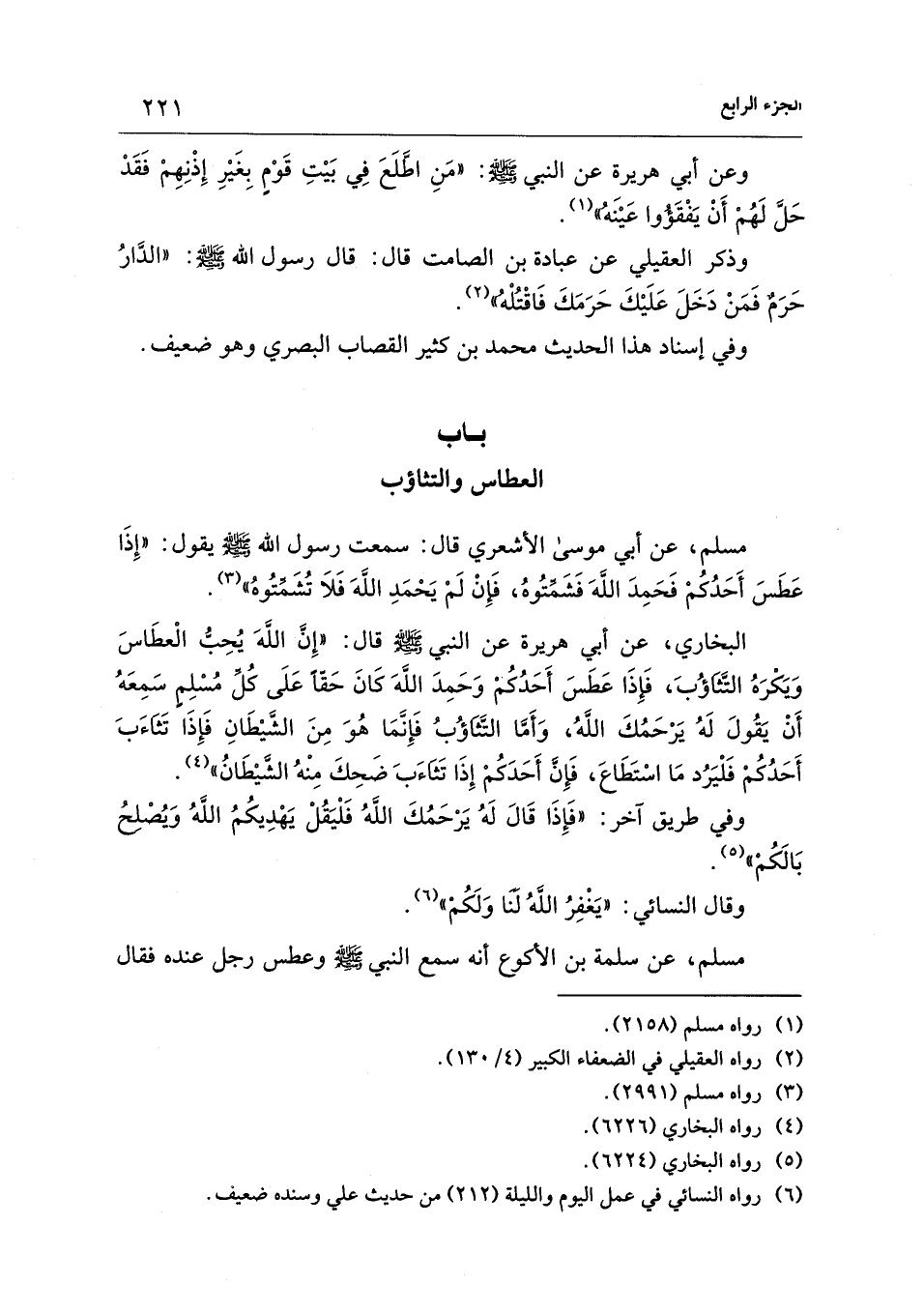 البخاري، عن أبي هريرة عن النبي - صلى الله عليه وسلم - قال: "إِنَّ اللهَ يُحِبُّ الْعطَاسَ وَيَكْرَهُ التَّثاؤُبَ، فَإِذَا عَطَسَ أَحَدُكُم وَحَمِدَ اللهَ كَانَ حَقًا عَلَى كُل مُسْلِمٍ سَمِعَهُ أَنْ يَقُولَ لَهُ يَرْحَمُكَ اللهُ، وَأَمَّا التَّثَاؤُبُ فَإِنَّما هُوَ مِنَ الشَّيْطَانِ فَإِذَا تَثَاءَبَ أَحَدُكُمْ فَلْيَرُد مَا اسْتَطَاعَ، فَإِنَّ أَحَدَكُمْ إِذَا تَثاءَبَ ضَحِكَ مِنْهُ الشَّيْطَانُ" (¬4).