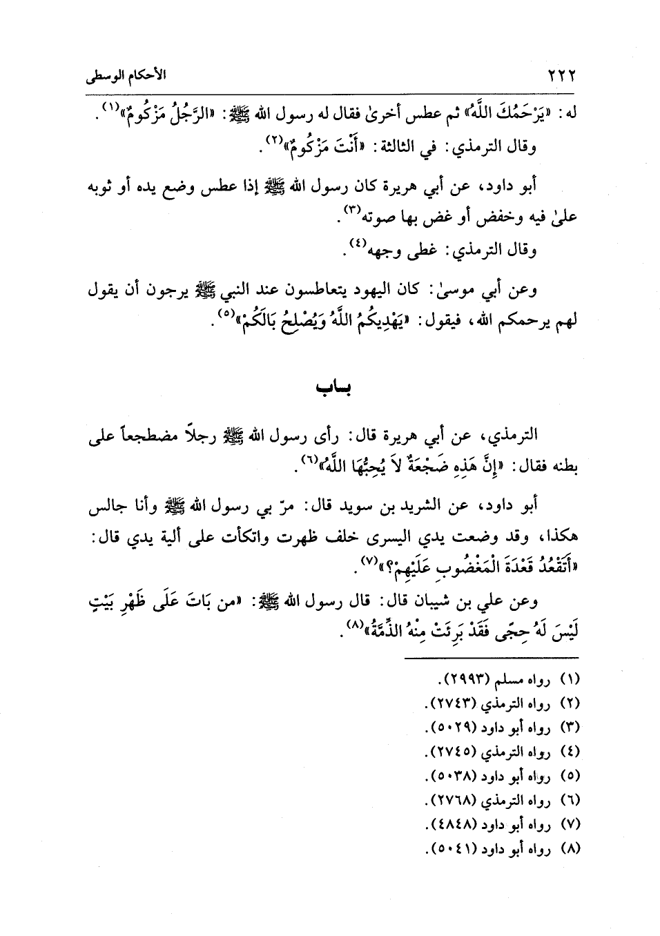 الترمذي، عن أبي هريرة قال: رأى رسول الله - صلى الله عليه وسلم - رجلًا مضطجعًا على بطنه فقال: "إِنَّ هَذ ضَجْعَةٌ لاَ يُحِبهَا اللهُ" (¬6).