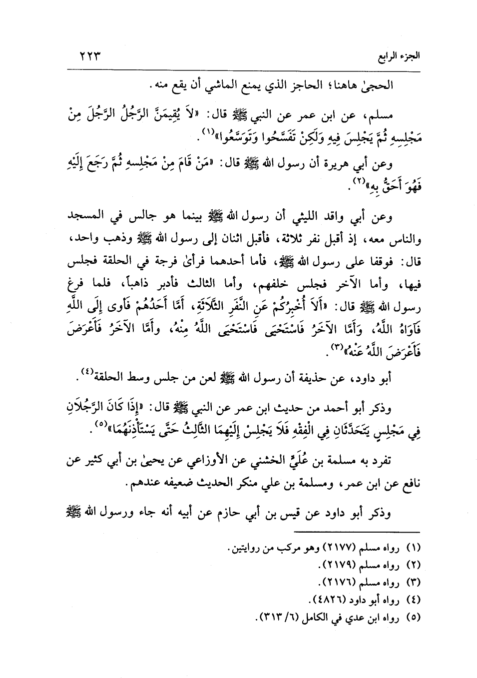 وذكر أبو أحمد من حديث ابن عمر عن النبي - صلى الله عليه وسلم - قال: "إِذَا كَانَ الرَّجُلاَنِ فِي مَجْلِسٍ يَتَحَدَّثَانِ فِي الْفِقْهِ فَلاَ يَجْلِسْ إِلَيْهِمَا الثَّالِثُ حَتَّى يَسْتَأْذِنَهُمَا" (¬5).