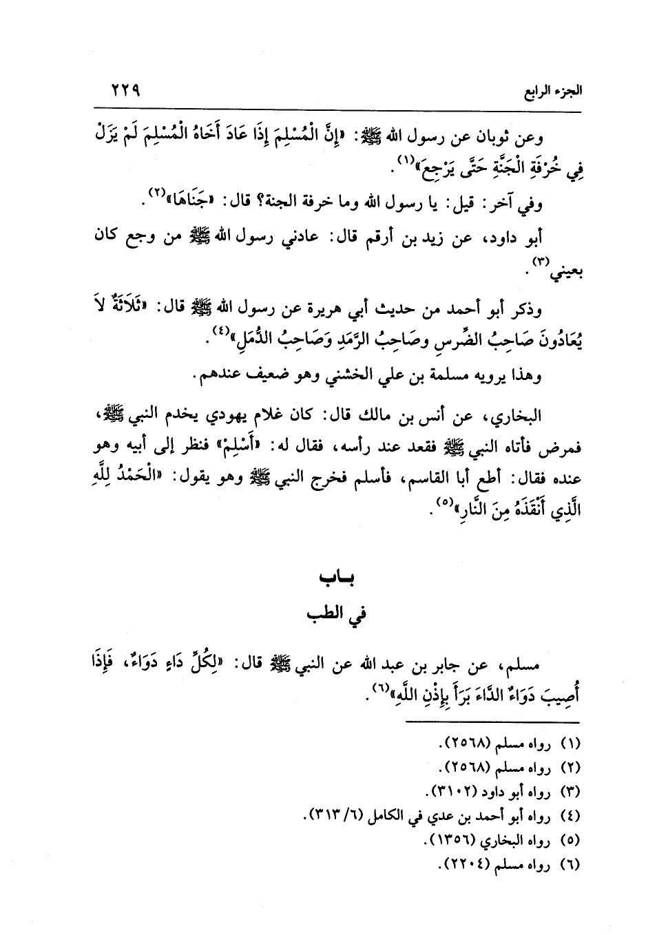 مسلم، عن جابر بن عبد الله عن النبي - صلى الله عليه وسلم - قال: "لِكُلِّ دَاءِ دَوَاءٌ، فَإِذَا أُصِيبَ دَوَاءٌ الدَّاءَ بَرَأَ بِإذنِ اللهِ" (¬6).