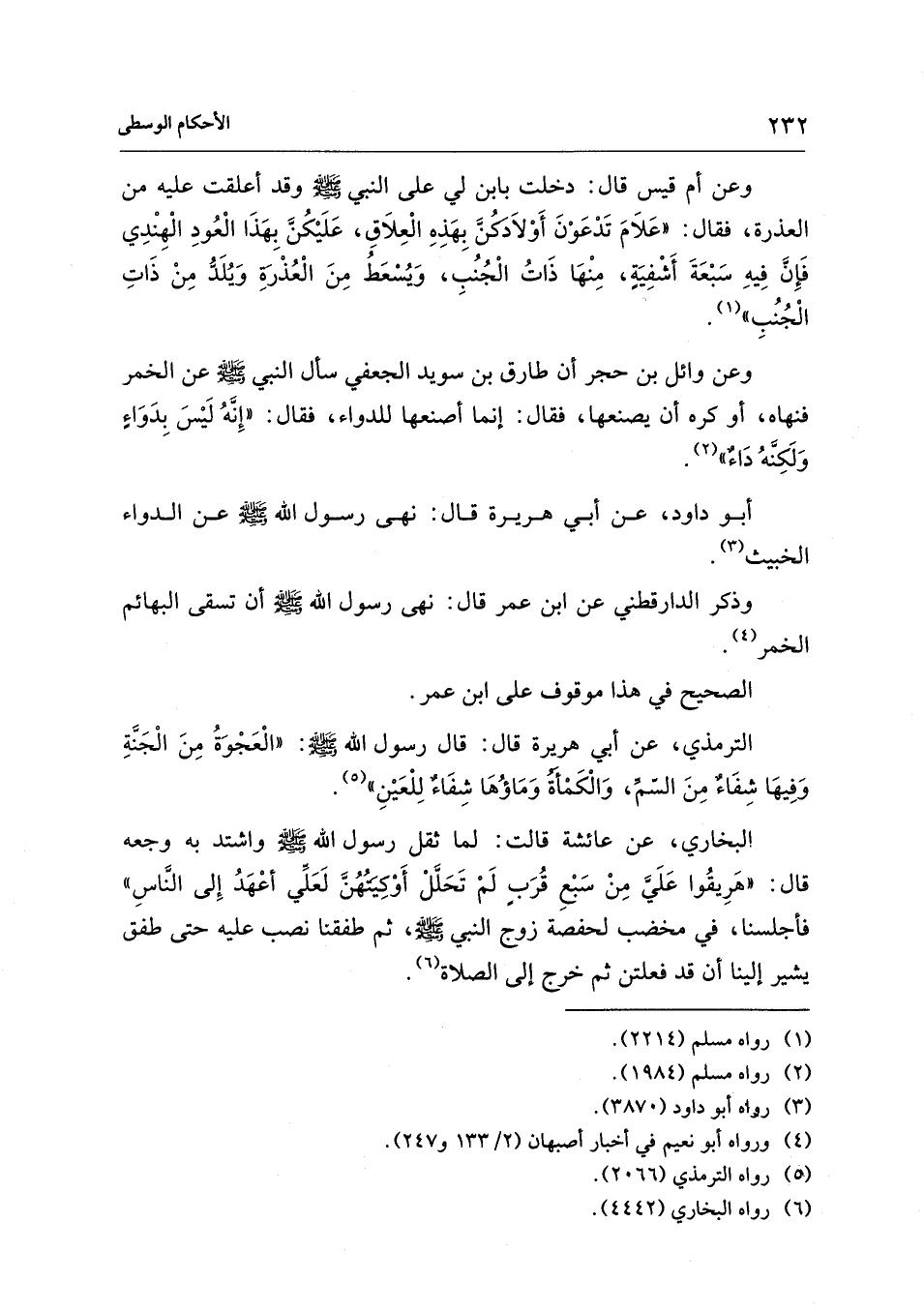 البخاري، عن عائشة قالت: لما ثقل رسول الله - صلى الله عليه وسلم - واشتد به وجعه قال: "هَرِيقُوا عَلَيَّ مِنْ سَبْعِ قُرَبٍ لَمْ تَحَللْ أَوْكِيتهُنَّ لَعَلي أعْهَدُ إِلى النَّاسِ" فأجلسنا، في مخضب لحفصة زوج النبي - صلى الله عليه وسلم -. ثم طفقنا نصب عليه حتى طفق يشير إلينا أن قد فعلتن ثم خرج إلى الصلاة (¬6).
