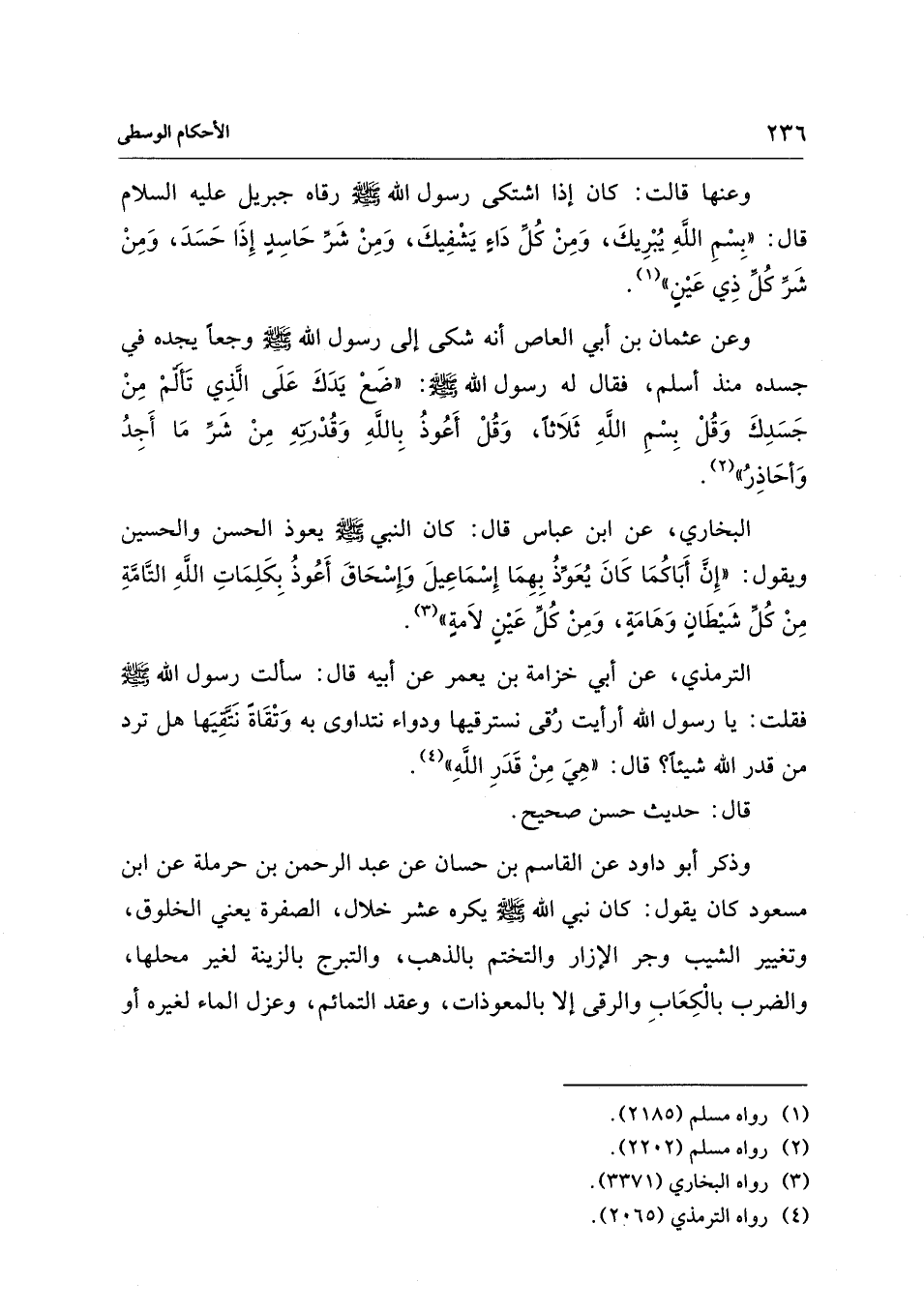 البخاري، عن ابن عباس قال: كان النبي - صلى الله عليه وسلم - يعوذ الحسن والحسين ويقول: "إِنَّ أَبَاكُمَا كَانَ يُعَوّذُ بِهِمَا إِسْمَاعِيلَ وإسْحَاقَ أَعُوذُ بِكَلِمَاتِ اللهِ التَّامَّةِ مِنْ كُلِّ شَيْطَانٍ وَهَامَةِ، وَمِنْ كُلِّ عَيْنٍ لاَمةٍ" (¬3).