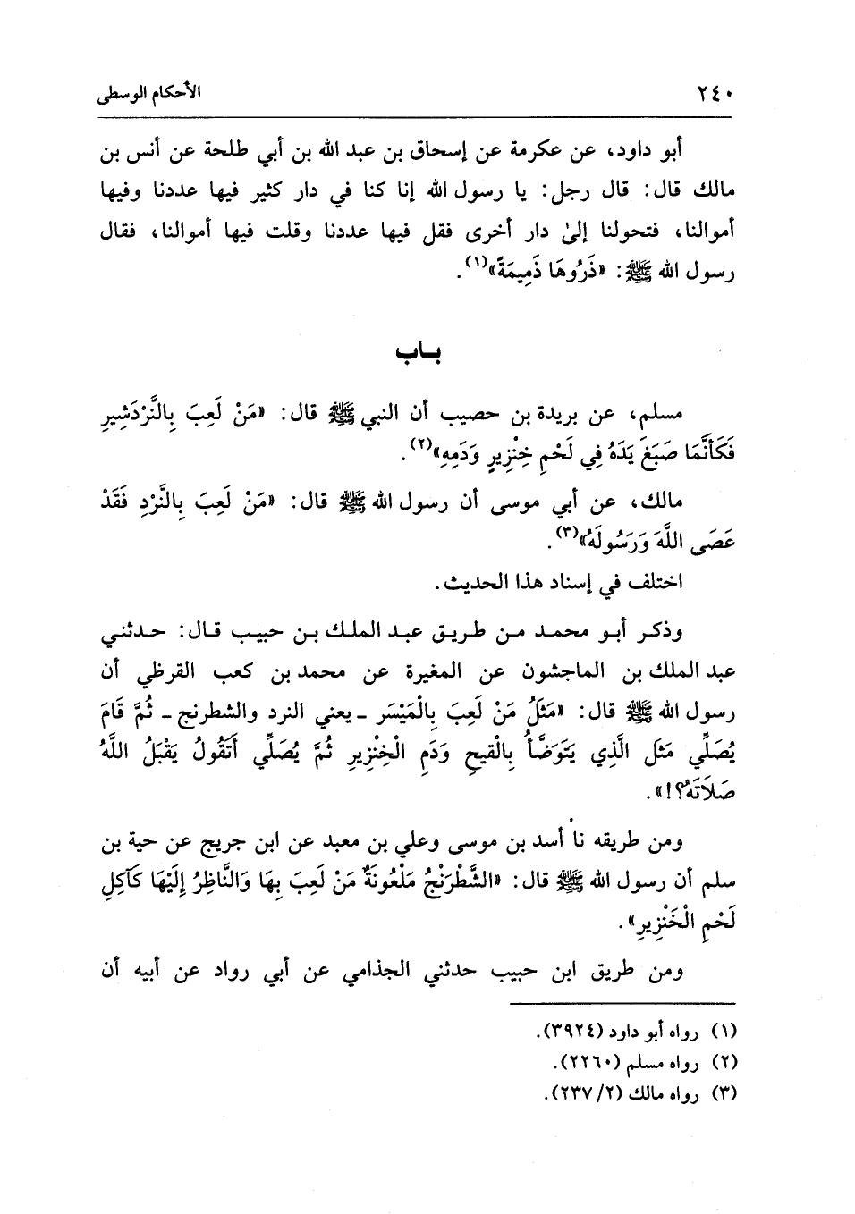 مالك، عن أبي موسى أن رسول الله - صلى الله عليه وسلم - قال: "مَنْ لَعِبَ بِالنَّرْدِ فَقَدْ عَصَى اللهَ وَرَسُولَهُ" (¬3).