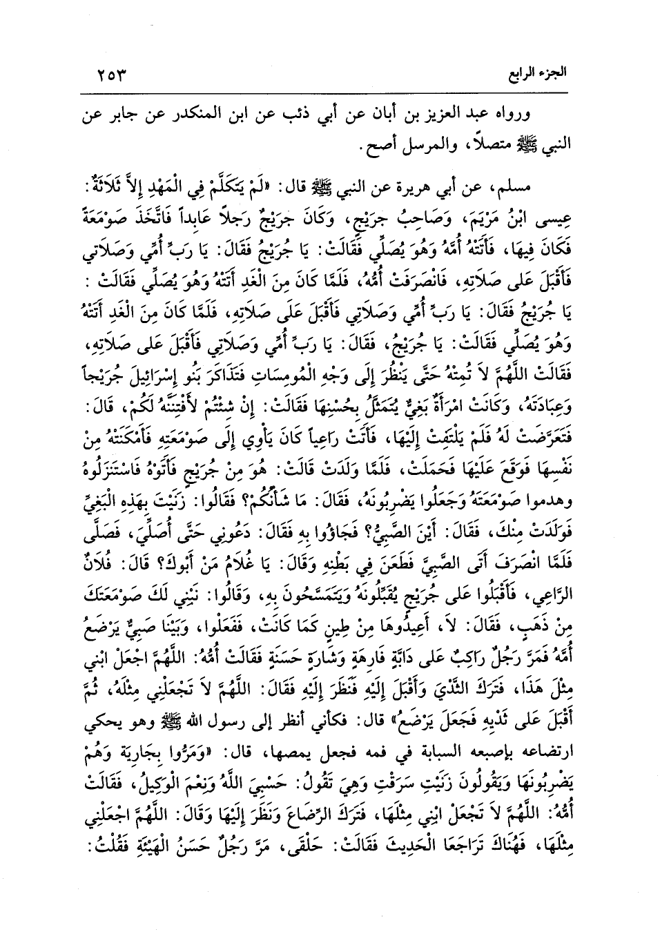مسلم، عن أبي هريرة عن النبي - صلى الله عليه وسلم - قال: "لَمْ يَتَكَلَّمْ فِي الْمَهْدِ إِلَّا ثَلاَثَةٌ: عِيسى ابْنُ مَرْيَمَ، وَصَاحِبُ جرَيْجٍ، وَكَانَ جرَيْجٌ رَجلًا عَابِدًا فَاتَّخَذَ صَوْمَعَةً فَكَانَ فِيهَا، فَأَتَتْهُ أُمَّهُ وَهُوَ يُصَلِّي فَقَالَتْ: يَا جُرَيْجُ فَقَالَ: يَا رَبِّ أُمِّي وَصَلاَتي فَأَقْبَلَ عَلى صَلاَتِهِ، فَانْصَرَفَتْ أُمُّهُ، فَلَمَّا كَانَ مِنَ الْغَدِ أَتَتْهُ وَهُوَ يُصَلِّي فَقَالَتْ: يَا جُرَيْجُ فَقَالَ: يَا رَبِّ أُمِّي وَصَلاَتِي فَأَقْبَلَ عَلَى صَلاَتِهِ، فَلَمَّا كَانَ مِنَ الْغَدِ أَتَتْهُ وَهُوَ يُصَلِّي فَقَالَتْ: يَا جُرَيْجُ، فَقَالَ: يَا رَبِّ أُمِّي وَصَلاَتِي فَأَقْبَلَ عَلى صَلاَتِهِ، فَقَالَتْ اللَّهُمَّ لاَ تُمِتْهُ حَتَّى يَنْظُرَ إِلَى وَجْهِ الْمُومِسَاتِ فَتَذَاكَرَ بَنُو إِسْرَائِيلَ جُرَيْجًا وَعِبَادَتَهُ، وَكَانَتْ امْرَأَةٌ بَغِيٌّ يتمَثَّلُ بِحُسْنِهَا فَقَالَت: إنْ شِئْتُمْ لأَفْتِننَّهُ لَكُمْ، قَالَ: فَتَعَرضَتْ لَهُ فَلَمْ يَلْتَفِتْ إِلَيْهَا، فَأَتَتْ راعِيًا كَانَ يَأوِي إِلَى صَوْمَعَتِهِ فَأَمْكَنَتْهُ مِنْ نَفْسِهَا فَوَقَعَ عَلَيْهَا فَحَمَلَتْ، فَلَمَّا وَلَدَتْ قَالَتْ: هُوَ مِنْ جُرَيْجٍ فَأَتَوْهُ فَاسْتَنزَلُوهُ وهدموا صَوْمَعَتَهُ وَجَعَلُوا يَضْرِبُونَهُ، فَقَالَ: مَا شَأْنُكُمْ؟ فَقَالُوا: زَنَيْتَ بهَذِهِ الْبَغِيِّ فَوَلَدَتْ مِنْكَ، فَقَالَ: أَيْنَ الصَّبِيُّ؟ فَجَاؤُوا بِهِ فَقَالَ: دَعُونِي حَتَّى أُصَلِّي، فَصَلَّى فَلَمَّا انْصَرَفَ أَتَى الصَّبِيَّ فَطَعَنَ فِي بَطْنِهِ وَقَالَ: يَا غُلاَمُ مَنْ أَبْوكَ؟ قَالَ: فُلاَنٌ الرَّاعِي، فَأَقبَلُوا عَلى جُرَيْجٍ يُقَبِّلُونَهُ وَيَتَمَسَّحُونَ بِهِ، وَقَالُوا: نَبْنِي لَكَ صَوْمَعَتَكَ مِنْ ذَهَبٍ، فَقَالَ: لاَ، أَعِيدُوهَا مِنْ طِينٍ كَمَا كَانَتْ، فَفَعَلْوا، وَبَيْنَا صَبِيٌّ يَرْضَعُ أُمَّهُ فَمَرَّ رَجُلٌ راكِبٌ عَلى دَابَّةٍ فَارِهَةٍ وَشَارَةٍ حَسَنَةٍ فَقَالَتْ أُمُّهُ: اللَّهُمَّ اجْعَلْ ابْني مِثْلَ هَذَا، فَتَرَكَ الثَّديَ وَأَقْبَلَ إِلَيْهِ فنظَرَ إِلَيْهِ فَقَالَ: اللَّهُمَّ لاَ تَجْعَلْنِي مِثْلَهُ، ثُمَّ أَقْبَلَ عَلى ثَدْيِهِ فَجَعَلَ يَرْضَعُ" قال: فكأني أنظر إلى رسول الله - صلى الله عليه وسلم - وهو يحكي ارتضاعه بإصبعه السبابة في فمه فجعل يمصها، قال: "وَمَرُّوا بِجَارِيَة وَهُمْ يَضْرِبُونَهَا وَيَقُولُونَ زَنَيْتِ سَرَقْتِ وَهِيَ تَقُولُ: حَسْبِيَ اللهُ وَنعمَ الْوَكِيلُ، فَقَالَتْ أُمُّهُ: اللَّهُمَّ لاَ تَجْعَلْ ابني مِثْلَهَا، فَتَرَكَ الرِّضَاعَ وَنَظَرَ إِلَيْهَا وَقَالَ: اللَّهُمَّ اجْعَلْنِي مِثْلَهَا، فَهُنَاكَ تَرَاجَعَا الْحَدِيثَ فَقَالَتْ: حَلْقَى، مَرَّ رَجُل حَسَنُ الْهَيْئَةِ فَقُلْتُ:
