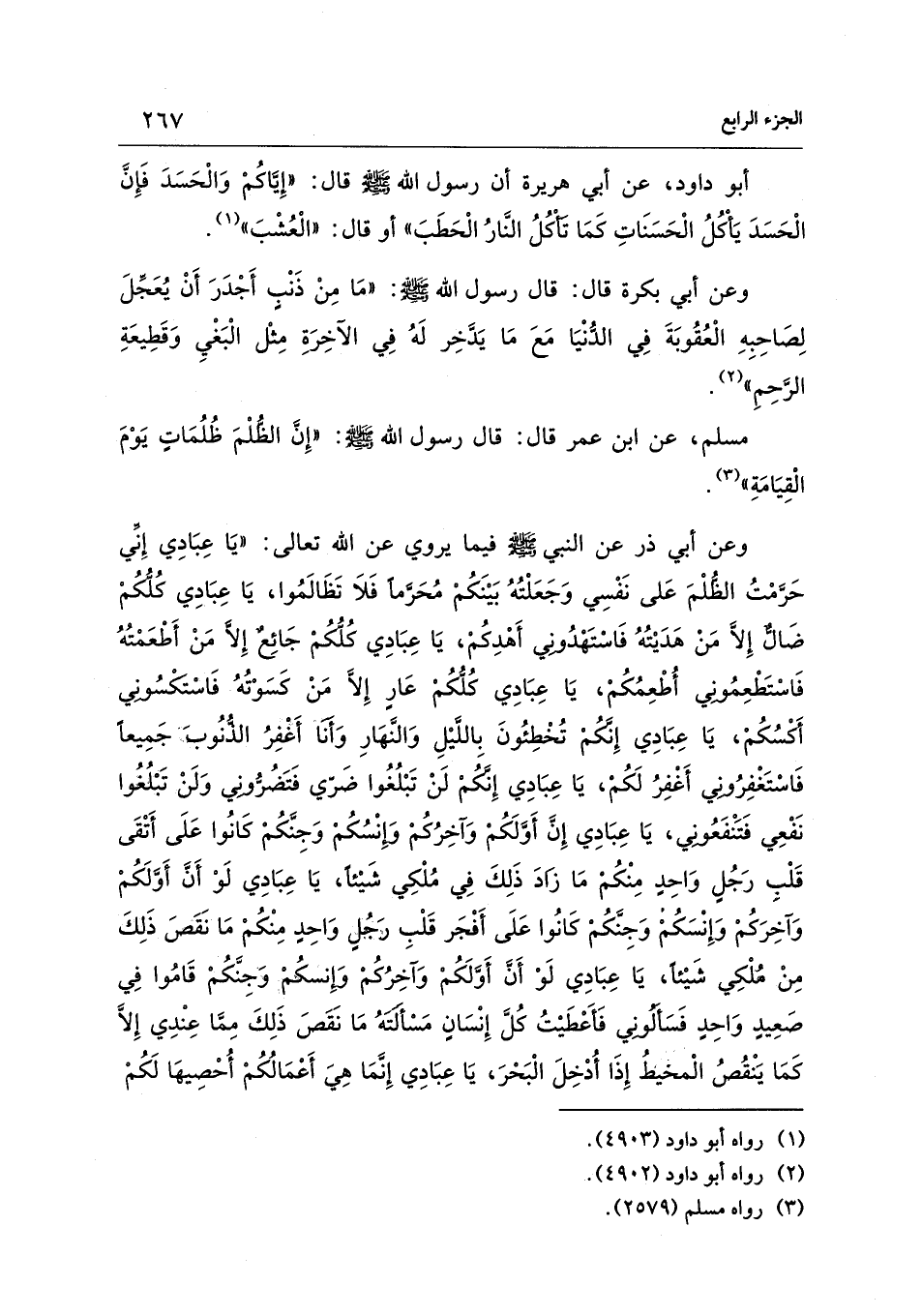 وعن أبي ذر عن النبي - صلى الله عليه وسلم - فيما يروي عن الله تعالى: "يَا عِبَادِي إِنِّي حَرَّمْتُ الظُّلْمَ عَلى نَفْسِي وَجَعَلْتُهُ بَيْنَكُمْ مُحَرمًا فَلاَ تَظَالَمُوا، يَا عِبَادِي كُلُّكُمْ ضَالٌّ إِلَّا مَنْ هَدَيْتُهُ فَاسْتَهْدُوني أَهْدِكُمْ، يَا عِبَادِي كُلُّكُمْ جَائِعٌ إِلَّا مَنْ أَطْعَمْتُهُ فَاسْتَطْعِمُوني أُطْعِمُكُمْ، يَا عِبَادِي كُلُّكُمْ عَارٍ إِلَّا مَنْ كَسَوْتُهُ فَاسْتكسُوني أَكْسُكُمْ، يَا عِبَادِي إِنَّكُمْ تُخْطِئُونَ بِاللَّيْلِ وَالنَّهَارِ وَأنَا أَغْفِرُ الذُّنُوبَ جَمِيعًا فَاسْتَغْفِرُوني أَغْفِرُ لَكُمْ، يَا عِبَادِي إِنَّكُمْ لَنْ تَبْلُغُوا ضَرّي فَتَضُرُّونِي وَلَنْ تَبْلُغُوا نَفْعِي فَتَنْفَعُونِي، يَا عِبَادِي إِنَّ أَوَّلَكُمْ وَآخِرُكُمْ وإنْسُكُمْ وَجِنَّكُمْ كَانُوا عَلَى أَتْقَى قَلْبِ رَجُلٍ وَاحِدٍ مِنْكُمْ مَا زادَ ذَلِكَ فِي مُلْكِي شَيْئًا، يَا عِبَادِي لَوْ أَنَّ أَوَّلَكُمْ وَآخِرَكُمْ وَإِنْسَكُمْ وَجِنَّكُمْ كَانُوا عَلَى أَفْجَر قَلْبِ رجُلٍ وَاحِدٍ مِنْكُمْ مَا نَقَصَ ذَلِكَ مِنْ مُلْكِي شَيْئًا، يَا عِبَادِي لَوْ أَنَّ أَوَّلَكُمْ وَآخِرُكُمْ وَإِنسكُمْ وَجِنَّكُمْ قَامُوا فِي صَعِيدٍ وَاحِدٍ فَسَأَلُوني فَأَعْطَيْتُ كُلَّ إِنْسَانٍ مَسْأَلتهُ مَا نَقَصَ ذَلِكَ مِمَّا عِنْدِي إِلَّا كَمَا يَنْقُصُ الْمخيطُ إِذَا أُدْخِلَ الْبَحْرَ، يَا عِبَادِي إِنَّمَا هِيَ أَعْمَالُكُمْ أُحْصِيهَا لَكُمْ
