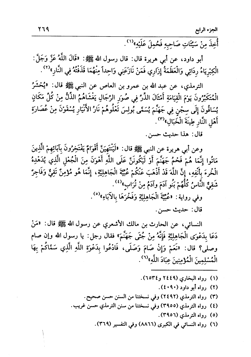 النسائي، عن الحارث بن مالك الأشعري عن رسول الله - صلى الله عليه وسلم - قال: "مَنْ دَعَا بِدَعْوى الْجَاهِلِيَّةِ فَإِنَّهُ مِنْ جُثَى جَهَنَّمَ" فقال رجل: يا رسول الله وإن صام وصلى؟ قال: "نَعَمْ وإنْ صَامَ وَصَلَى، فَادْعُوا بِدَعْوة اللهِ الَّذِي سَمَّاكُمْ بِهَا الْمُسْلِمِينَ الْمُؤمِنِينَ عِبَادَ اللهِ" (¬6).