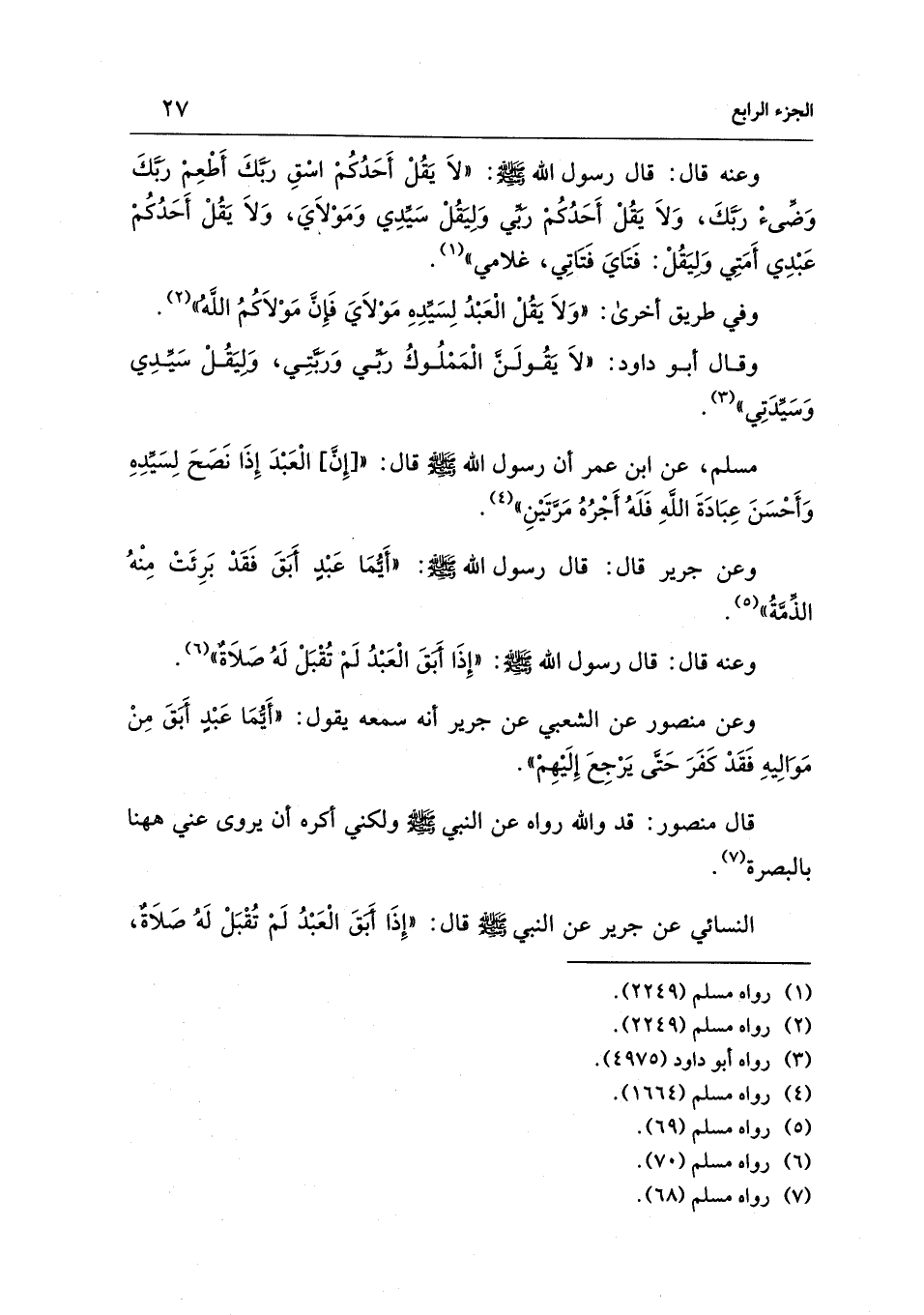 وعنه قال: قال رسول الله - صلى الله عليه وسلم -: "لاَ يَقُلْ أَحَدُكُم اسْقِ رَبَكَ أَطْعِم رَبَّكَ وَضِّئْ رَبَّكَ، وَلاَ يَقُلْ أَحَدُكم رَبِّي وَلِيقُلْ سَيِّدِي وَمَوْلاَيَ، وَلاَ يَقُلْ أَحَدُكُمْ عَبْدِي أَمَتِي وَلِيَقُلْ: فَتَايَ فَتَاتِي، غلامي" (¬1).