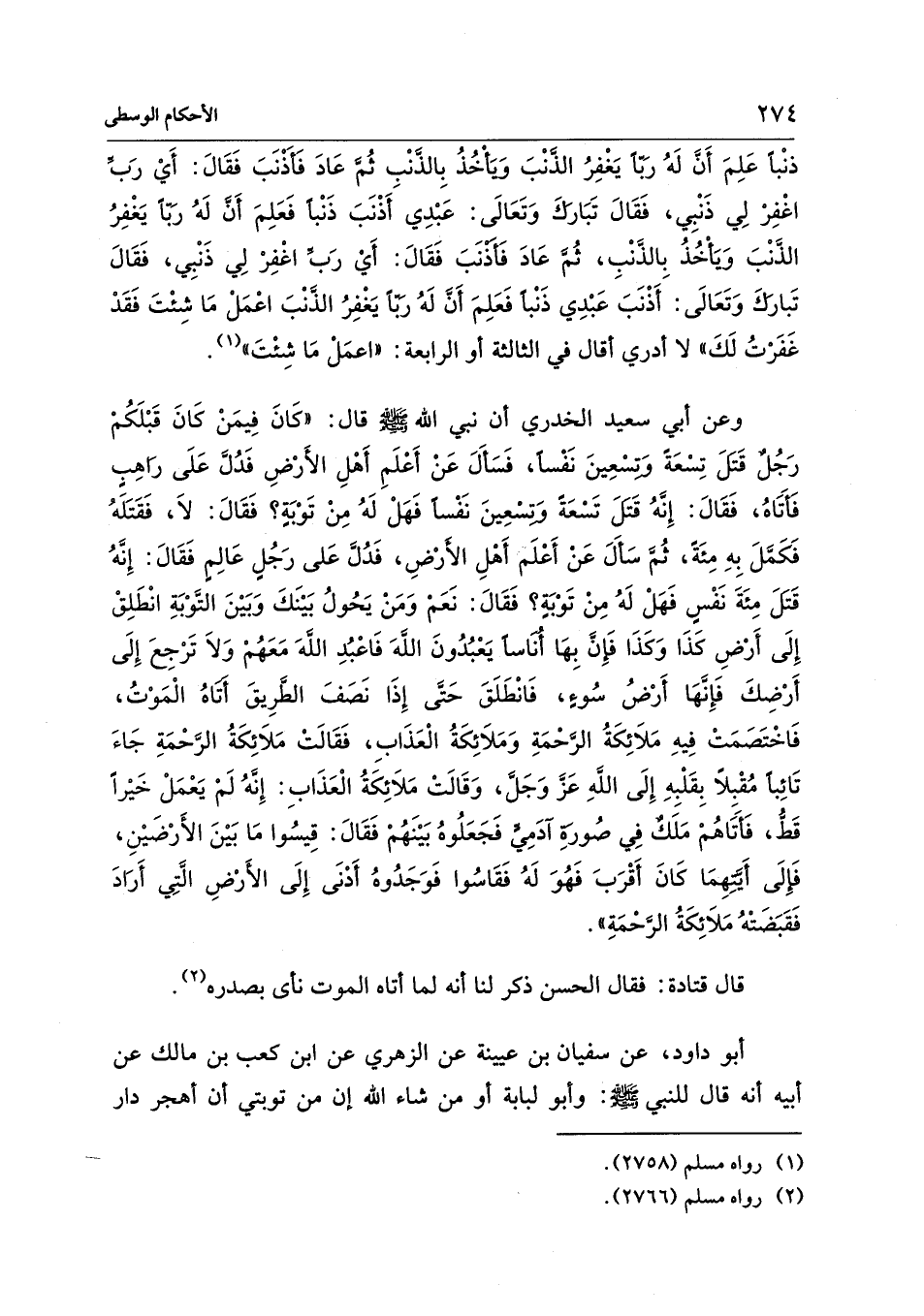 وعن أبي سعيد الخدري أن نبي الله - صلى الله عليه وسلم - قال: "كَانَ فِيمَنْ كَانَ قَبْلَكُمْ رَجُلٌ قَتلَ تِسْعَةَ وتسْعِينَ نَفْسًا، فَسَألَ عَنْ أَعْلَمِ أَهْلِ الأَرْضِ فَدُلَّ عَلَى راهِبٍ فَأَتًاهُ، فَقَال: إِنَّهُ قَتلَ تَسْعَةَ وتسْعِينَ نَفْسًا فَهَلْ لَهُ مِنْ تَوْبَةٍ؟ فَقَالَ: لاَ، فَقَتَلَهُ فَكَملَ بِهِ مِئَةً، ثُمَّ سَأَلَ عَنْ أَعْلَم أَهْلِ الأرْضِ، فَدُلَّ عَلى رَجُلٍ عَالِمٍ فَقَالَ: إِنَّه قَتلَ مِئَةَ نَفْسٍ فَهَلْ لَهُ مِنْ تَوْبَةِ؟ فَقَالَ: نَعَمْ وَمَنْ يَحُولُ بَيْنَكَ وَبَيْنَ التَّوْبَةِ انْطَلِقْ إِلَى أَرْضِ كَذَا وَكَذَا فَإنَّ بِهَا أُناسًا يَعْبُدُونَ اللهَ فَاعْبُدِ اللهَ مَعَهُمْ وَلاَ تَرْجِعَ إِلَى أَرْضِكَ فَإِنَّهَا أَرْضُ سُوءِ، فَانْطَلَقَ حَتَّى إِذَا نَصَفَ الطَّرِيقَ أَتَاهُ الْمَوْتُ، فَاخْتَصَمَتْ فِيهِ مَلاَئِكَةُ الرَّحْمَةِ وَمَلاَئِكَةُ الْعَذَابِ، فَقَالَتْ مَلاَئِكَةُ الرَّحْمَةِ جَاءَ تَائِبًا مُقْبِلًا بِقَلْبِهِ إِلَى اللهِ عَزَّ وَجَلَّ، وَقَالَتْ مَلاَئِكَةُ الْعَذَابِ: إِنَّه لَمْ يَعْمَلْ خَيْرًا قَطُّ، فَأَتَاهُمْ مَلَك فِي صُورة آدَمي فَجَعَلُوهُ بَيْنَهُمْ فَقَالَ: قِيسُوا مَا بَيْنَ الأَرْضَيْنِ، فَإلَى أَيَّتِهِمَا كَانَ أَقْرَبَ فَهُوَ لَهُ فَقَاسُوا فَوَجَدُوهُ أَدْنَى إِلَى الأَرْضِ الَّتِي أَرَادَ فَقَبَضَتْهُ مَلاَئِكَةُ الرَّحْمَةِ".