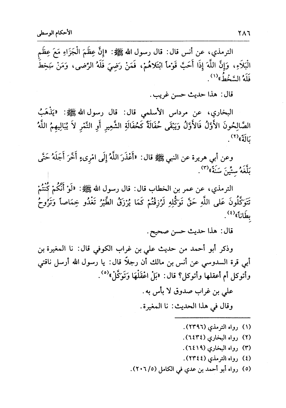 الترمذي، عن أنس قال: قال رسول الله - صلى الله عليه وسلم -: "إِنَّ عِظَمَ الْجَزَاءِ مَعَ عِظَمِ الْبَلاَءِ، وَإِنَّ اللهَ إِذَا أَحَبَّ قَوْمًا ابْتَلاهُمْ، فَمَنْ رَضِيَ فَلَهُ الرِّضى، وَمَنْ سخِطَ فَلَهُ السَّخْطُ" (¬1).