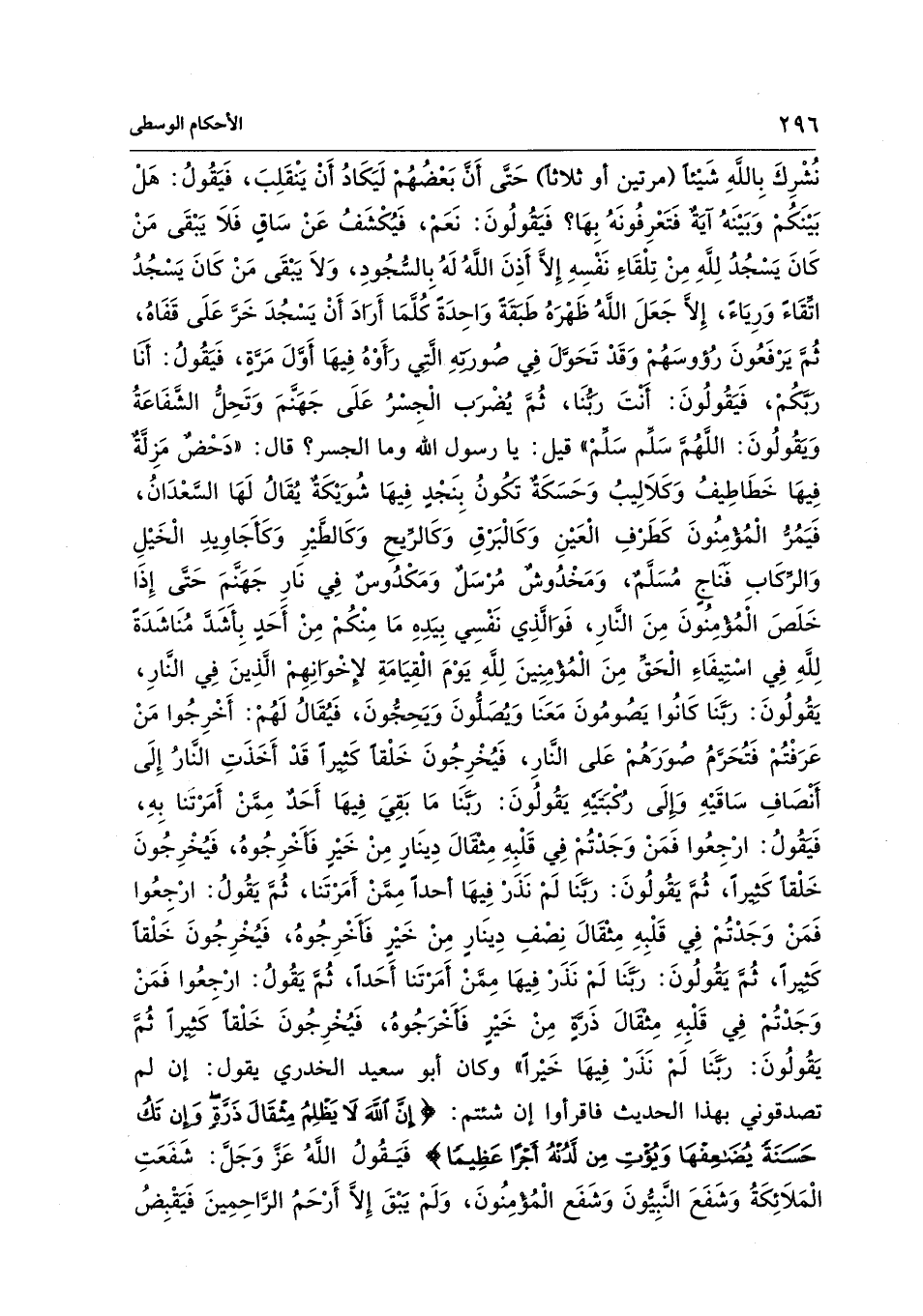 نُشْرِكَ بِاللهِ شَيْئًا (مرتين أو ثلاثًا) حَتَّى أَنَّ بَعْضُهُمْ لَيَكَادُ أَنْ يَنْقَلِبَ، فَيَقُولُ: هَلْ بَيْنَكُمْ وَبَيْنَهُ آيَةٌ فَتَعْرِفُونَهُ بِهَا؟ فَيَقُولُونَ: نَعَمْ، فَيُكْشَفُ عَنْ سَاقِ فَلاَ يَبْقَى مَنْ كَانَ يَسْجُدُ للهِ مِنْ تِلْقَاءِ نَفْسِهِ إِلَّا أَذِنَ اللهُ لَهُ بِالسُّجُودِ، وَلاَ يَبْقَى مَنْ كَانَ يَسْجُدُ اتِّقَاءَ وَرِيَاءَ، إِلَّا جَعَلَ اللهُ ظَهْرَهُ طَبَقَةَ وَاحِدَةَ كلَّمَا أَرَادَ أَنْ يَسْجُدَ خَرَّ عَلَى قَفَاهُ، ثُمَّ يَرْفَعُونَ رُؤوسَهُمْ وَقَدْ تَحَوَّلَ فِي صُورَتِهِ الَّتِي رَأَوْهُ فِيهَا أَوَّلَ مَرَّةِ، فَيَقُولُ: أَنا ربَّكُمْ، فَيَقُولُونَ: أَنْتَ رَبُنَا، ثُمَّ يُضْرَب الْجِسْرُ عَلَى جَهَنَّمَ وَتَحِلُّ الشَفَاعَةُ وَتقُولُونَ: اللَّهُمَّ سَلِّم سَلِّمْ" قيل: يا رسول الله وما الجسر؟ قال: "دَحْضٌ مَزِلَّةٌ فِيهَا خَطَاطِيفُ وَكَلاَلِيبُ وَحَسَكَة تَكُونُ بِنَجْدٍ فِيهَا شُوَيْكَةٌ يُقَالُ لَهَا السَّعْدَانُ، فَيَمُرُّ الْمُؤمِنُونَ كَطَرْفِ الْعَيْنِ وَكَالْبَرْقِ وَكَالرِّيحِ وَكَالطَّيْرِ وَكَأَجَاوِيدِ الْخَيْلِ وَالرِّكَابِ فَنَاجِ مُسَلَّمٌ، وَمَخْدُوشٌ مُرْسَلٌ وَمَكْدُوسٌ فِي نَارِ جَهَنَّمَ حَتَّى إِذَا خَلَصَ الْمُؤمِنُونَ مِنَ النَّارِ، فَوَالَّذِي نَفْسِي بِيَدِهِ مَا مِنْكُمْ مِنْ أَحَدٍ بِأَشَدَّ مُنَاشَدَةَ للهِ فِي اسْتِيفَاءِ الْحَق مِنَ الْمُؤْمِنِينَ للهِ يَوْمَ الْقِيَامَةِ لإِخْوَانِهِمْ الَّذِينَ فِي النَّارِ، يَقُولُونَ: رَبَّنَا كَانُوا يَصُومُونَ مَعَنَا وَيُصَلُّونَ وَيَحِجُّونَ، فَيُقَالُ لَهُمْ: أَخْرِجُوا مَنْ عَرَفْتُمْ فَتُحَرَّمُ صُوَرَهُمْ عَلى النَّارِ، فَيُخْرِجُونَ خَلْقًا كثِيرًا قَدْ أَخَذَتِ النَّارُ إِلَى أَنْصَافِ سَاقَيْهِ وَإِلَى رُكْبَتيهِ يَقُولُونَ: رَّبنَا مَا بَقِيَ فِيهَا أَحَدٌ مِمَّنْ أَمَرْتَنا بِهِ، فَيَقولُ: ارْجِعُوا فَمَنْ وَجَدْتُمْ فِي قَلْبِهِ مِثْقَالَ دِينَارِ مِنْ خَيْرٍ فأَخرِجُوهُ، فَيُخْرِجُونَ خَلْقًا كَثِيرًا، ثُمَّ يَقُولُونَ: رَبَّنَا لَمْ نَذَرْ فِيهَا أحدًا مِمَّنْ أَمَرْتَنا، ثُمَّ يَقُولُ: ارْجِعُوا فَمَنْ وَجَدْتُمْ فِي قَلْبِهِ مِثْقَالَ نِصْفِ دِينَارِ مِنْ خَيْرِ فَأَخْرِجُوهُ، فَيُخْرِجُونَ خَلْقًا كَثِيرًا، ثُمَّ يَقُولُونَ: رَبَّنَا لَمْ نَذَرْ فِيهَا مِمَّنْ أَمَرْتَنا أَحَدًا، ثُمَّ يَقُولُ: ارْجعُوا فَمَنْ وَجَدْتُمْ فِي قَلْبِهِ مِثقالَ ذَرَّةٍ مِنْ خَيْرِ فَأَخْرَجُوهُ، فَيُخْرِجُونَ خَلْقًا كَثِيرًا ثُمَّ يَقُولُونَ: ربَّنَا لَمْ نَذَرْ فِيهَا خَيْرًا" وكان أبو سعيد الخدري يقول: إن لم تصدقوني بهذا الحديث فاقرأوا إن شئتم: {إِنَّ اللَّهَ لَا يَظْلِمُ مِثْقَالَ ذَرَّةٍ وَإِنْ تَكُ حَسَنَةً يُضَاعِفْهَا وَيُؤْتِ مِنْ لَدُنْهُ أَجْرًا عَظِيمًا} فَيَقُولُ اللهُ عَزَّ وَجَلَّ: شَفَعَتِ الْمَلاَئِكَةُ وَشَفَعَ النَّبِيُّونَ وَشَفَع الْمُؤمِنُونَ، وَلَمْ يَبْقَ إِلَّا أَرْحَمُ الرَّاحِمِينَ فَيَقْبِضُ