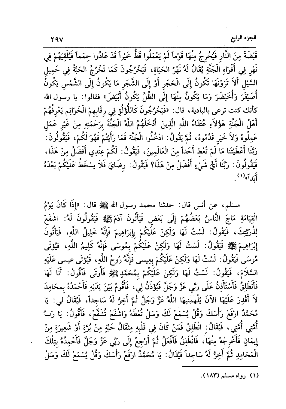 مسلم، عن أنس قال: حدثنا محمد رسول الله - صلى الله عليه وسلم - قال: "إِذَا كانَ يَوْمُ الْقِيَامَةِ مَاجَ النَّاسُ بَعْضُهُمْ إِلَى بَعْضٍ فَيَأْتُونَ آدَمَ - صلى الله عليه وسلم - فَيَقُولُونَ لَهُ: اشْفَعْ لِذُرّيَّتِكَ، فيَقُولُ: لَسْتُ لَهَا وَلَكِنْ عَلَيْكُمْ بِإِبْرَاهِيمَ فَإِنَّهُ خَلِيلُ اللهِ، فَيَأْتُونَ إِبْرَاهِيمَ - صلى الله عليه وسلم - فَيَقُولُ: لَسْتُ لَهَا وَلَكِنْ عَلَيكُمْ بِمُوسَى فَإِنَّهُ كَلِيمُ اللهِ، فيُؤتَى مُوسَى فَيَقُولُ: لَسْتُ لَهَا وَلَكِنْ عَلَيْكُمْ بِعِيسى فَإِنَّهُ رُوحُ اللهِ، فَيُؤتَى عيسى عَلَيْهِ السَّلاَمَ، فَيَقُولُ: لَسْتُ لَهَا وَلَكِنْ عَلَيْكُمْ بِمُحَمَّدٍ - صلى الله عليه وسلم - فَأُوتَى فَأَقُولُ: أَنَا لَهَا فَأَنطَلِقُ فَأَسْتَاْذِنُ عَلَى رَبَّي عَزَّ وَجَلَّ فَيُؤذَنُ لِي، فَأَقُومُ بَيْنَ يَدَيْهِ فَأحمَدُهُ بِمحَامِدَ لاَ أَقْدِرَ عَلَيْهَا الآنَ يُلْهمنيهَا اللهُ عَزَّ وَجَلَّ ثُمَّ أَخِرُّ لَهُ سَاجدًا، فَيُقَالُ لي: يَا مُحَمَّدٌ ارْفَعْ رَأْسَكَ وَقُلْ يُسمَعْ لَكَ وَسَلْ تُعْطَهُ وَاشْفَعْ تُشَفَّعْ، فَأَقُولُ: يَا رَبِّ أُمَّتِي أُمَّتِي، فَيُقَالُ انْطَلِقْ فمَنْ كَانَ فِي قَلْبِهِ مِثْقَالُ حَبَّةٍ مِنْ بُرَّةٍ أَوْ شَعِيرَةٍ مِنْ إِيمَانٍ فَأَخْرِجْهُ مِنْهَا، فَانْطَلِقُ فَأَفعَلُ ثُمَّ أَرْجِعُ إِلَى رَبِّي عَزَّ وَجَلَّ فَأَحْمِدُهُ بِتِلْكَ الْمَحَامِدِ ثُمَّ أَخِرُّ لَهُ سَاجِدًا فَيُقَالُ: يَا مُحَمَّدُ ارْفَعْ رَأْسَكَ وَقُلْ يُسْمَعْ لَكَ وَسَلْ