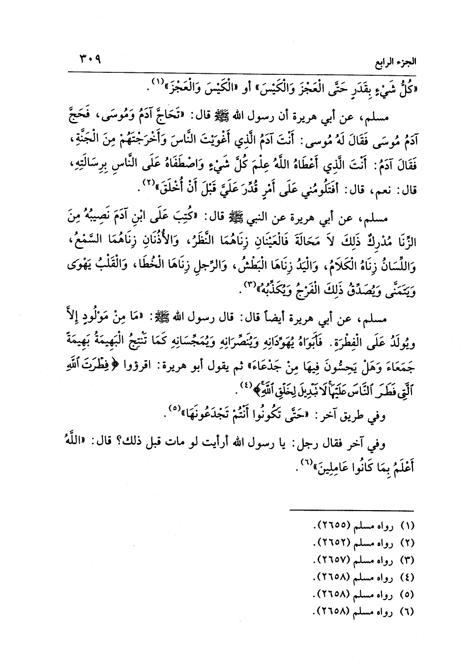 مسلم، عن أبي هريرة أن رسول الله - صلى الله عليه وسلم - قال: "تَحَاجَّ آدَمُ وَمُوسَى، فَحَجَّ آدَمُ مُوسَى فَقَالَ لَهُ مُوسى: أَنْتَ آدَمُ الَّذِي أَغْوَيْتَ النَّاسَ وَأَخْرَجْتَهُمْ مِنَ الْجَنَّةِ، فَقَالَ آدَمُ؟ أَنْتَ الَّذِي أَعْطَاهُ اللهُ عِلْمَ كُلَّ شَيْءٍ وَاصْطَفَاهُ عَلَى النَّاسِ بِرِسَالَتِهِ، قال: نعم، قال: أفَتَلُومُني عَلَى أَمْرٍ قُدِّرَ عَلَي قَبْلَ أَنْ أُخْلَقَ" (¬2).