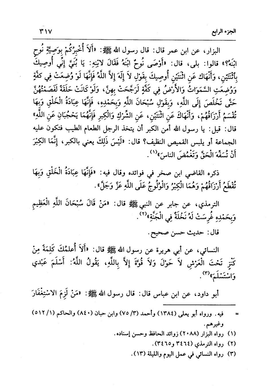 البزار، عن ابن عمر قال: قال رسول الله - صلى الله عليه وسلم -: "أَلاَ أُخْبِرُكُمْ بِوَصِيَّةِ نُوحٍ ابْنَه؟ " قالوا: بلى، قال: "أَوْصَى نُوحٌ ابْنَهُ فَقَالَ لابْنهِ: يَا بُنَي إِنِّي أُوصِيكَ بِأثْنتينِ، وَأَنْهَاك عَنِ اثْنَتَيْنِ أُوصِيكَ بقَوْلِ لاَ إِلَهَ إِلَّا اللهُ فَإِنَّهَا لَوْ وُضِعَتْ فِي كفةٍ وَوُضِعَتِ السَّمَوَاتُ وَالأرْضُ فِي كَفةٍ لَرَجَّحَتْ بِهِن، وَلَوْ كَانَتْ حَلَقَةً لَفَصَمْتُهُنَّ حَتَّى تَخْلَصَ إِلَى اللهِ، وَبِقَوْلِ سُبْحَانَ اللهِ وَبِحَمْدِهِ، فَإِنَّهَا عِبَادَةُ الْخَلْقِ وَبِهَا تُقْسَمُ أَرْزَاقُهُمْ، وَأَنْهَاكَ عَنِ اثْنَتينِ، عَنِ الشِّرْكِ وَالْكِبرِ فَإِنَّهُمَا يَحْجُبَانِ عَنِ اللهِ" قال: قيل: يا رسول الله أمن الكبر أن يتخذ الرجل الطعام الطيب فتكون عليه الجماعة أو يلبس القميص النظيف؟ قال: "لَيْسَ ذَلِكَ يعني بالكبر، إِنَّمَا الكِبْرَ أَنْ تُسَفِّهَ الْحَقَّ وَتَغْمُضَ الناسَ" (¬1).