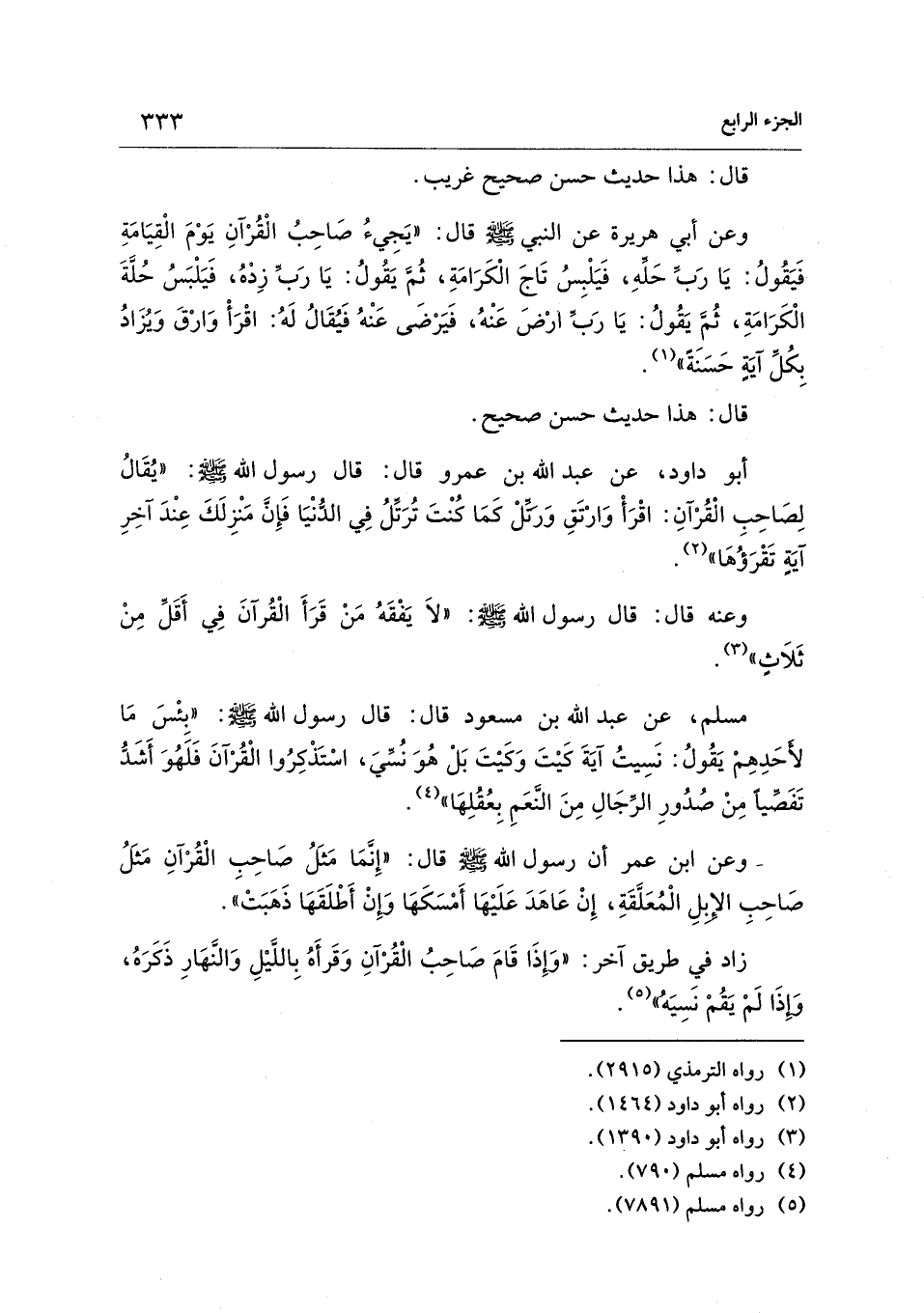 أبو داود، عن عبد الله بن عمرو قال: قال رسول الله - صلى الله عليه وسلم -: "يُقَالُ لِصَاحِبِ الْقُرْآنِ: اقْرَأْ وَارْتَقِ وَرتِّلْ كَمَا كُنْتَ تُرَتِّلُ فِي الدُّنْيَا فَإِن مَنْزِلَكَ عِنْدَ آخِرِ آيَةِ تَقْرَؤُهَا" (¬2).