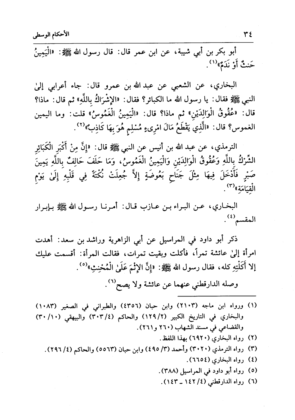 البخاري، عن الشعبي عن عبد الله بن عمرو قال: جاء أعرابي إلى النبي - صلى الله عليه وسلم - فقال: يا رسول الله ما الكبائر؟ فقال: "الإشْرَاكُ بِاللهِ" ثم قال: ماذا؟ قال: "عُقُوقُ الْوَالِدَيْنِ" ثم ماذا؟ قال: "الْيَمِينُ الْغَمُوسُ" قلت: وما اليمين الغموس؟ قال: "الَّذِي يَقْطَعُ مَالَ امرِئِ مُسْلِمِ هُوَ بِها كَاذِبٌ" (¬2).