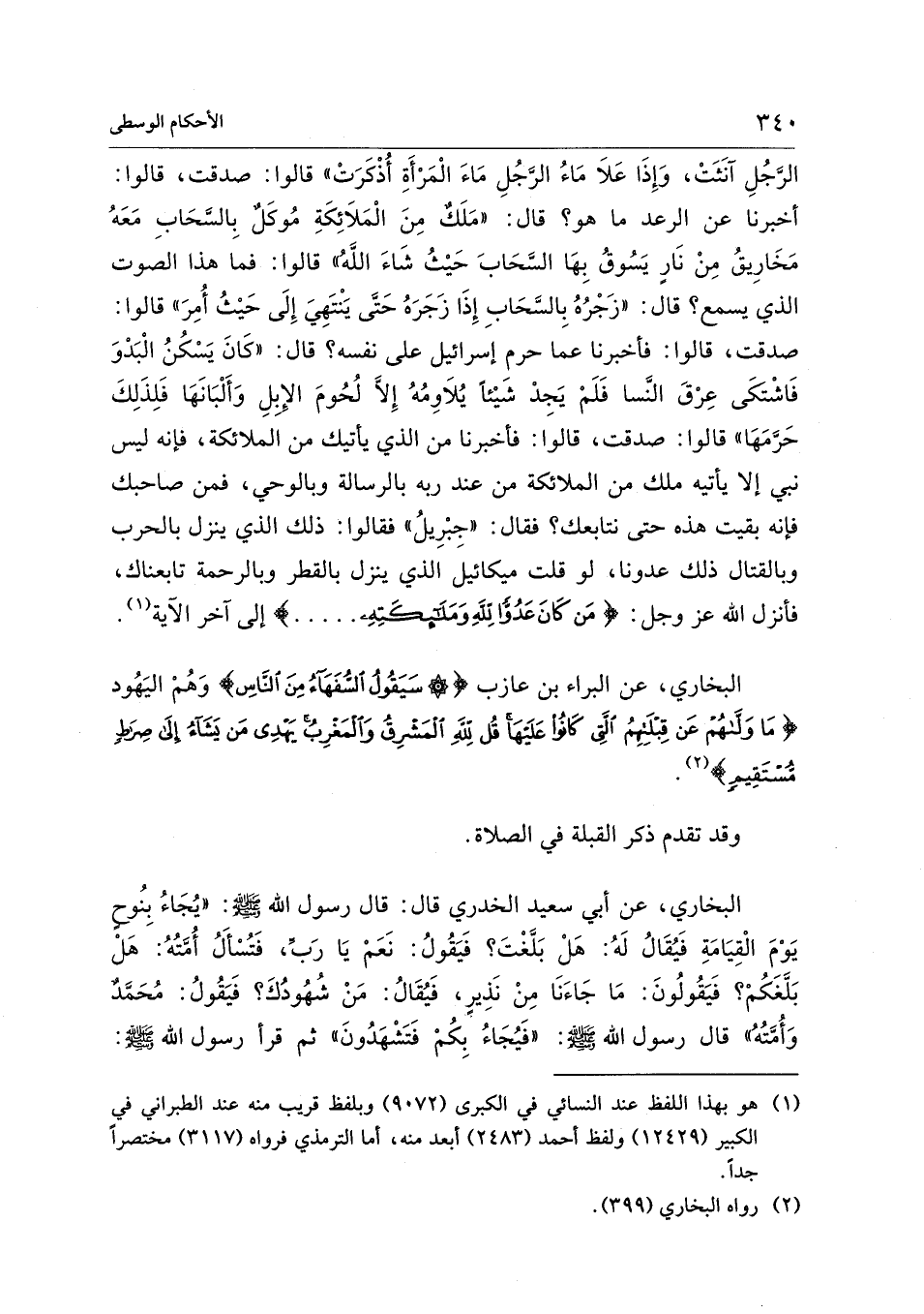 الرَّجُلِ آنَثَتْ، وَإِذَا عَلاَ مَاءُ الرَّجُلِ مَاءَ الْمَرْأَةِ أُذْكَرَتْ" قالوا: صدقت، قالوا: أخبرنا عن الرعد ما هو؟ قال: "مَلَكٌ مِنَ الْمَلاَئِكَةِ مُوكَلٌ بِالسَّحَابِ مَعَهُ مَخَارِيقُ مِنْ نَارٍ يَسُوقُ بِهَا السَّحَابَ حَيْثُ شَاءَ اللهُ" قالوا: فما هذا الصوت الذي يسمع؟ قال: "زَجْرُهُ بِالسَّحَابِ إِذَا زَجَرَهُ حَتَّى يَنْتَهِيَ إِلَى حَيْثُ أُمِرَ" قالوا: صدقت، قالوا: فأخبرنا عما حرم إسرائيل على نفسه؟ قال: "كَانَ يَسْكُنُ الْبَدْوَ فَاشْتكَى عِرْقَ النَّسا فَلَمْ يَجِدْ شَيْئًا يُلاَوِمُهُ إِلَّا لُحُومَ الإِبِلِ وَأَلْبَانَهَا فَلِذَلِكَ حَرَّمَهَا" قالوا: صدقت، قالوا: فأخبرنا من الذي يأتيك من الملائكة، فإنه ليس نبي إلا يأتيه ملك من الملائكة من عند ربه بالرسالة وبالوحي، فمن صاحبك فإنه بقيت هذه حتى نتابعك؟ فقال: "جِبْرِيلُ" فقالوا: ذلك الذي ينزل بالحرب وبالقتال ذلك عدونا، لو قلت ميكائيل الذي ينزل بالقطر وبالرحمة تابعناك، فأنزل الله عز وجل: {مَنْ كَانَ عَدُوًّا لِلَّهِ وَمَلَائِكَتِهِ. . . . .} إلى آخر الآية (¬1).