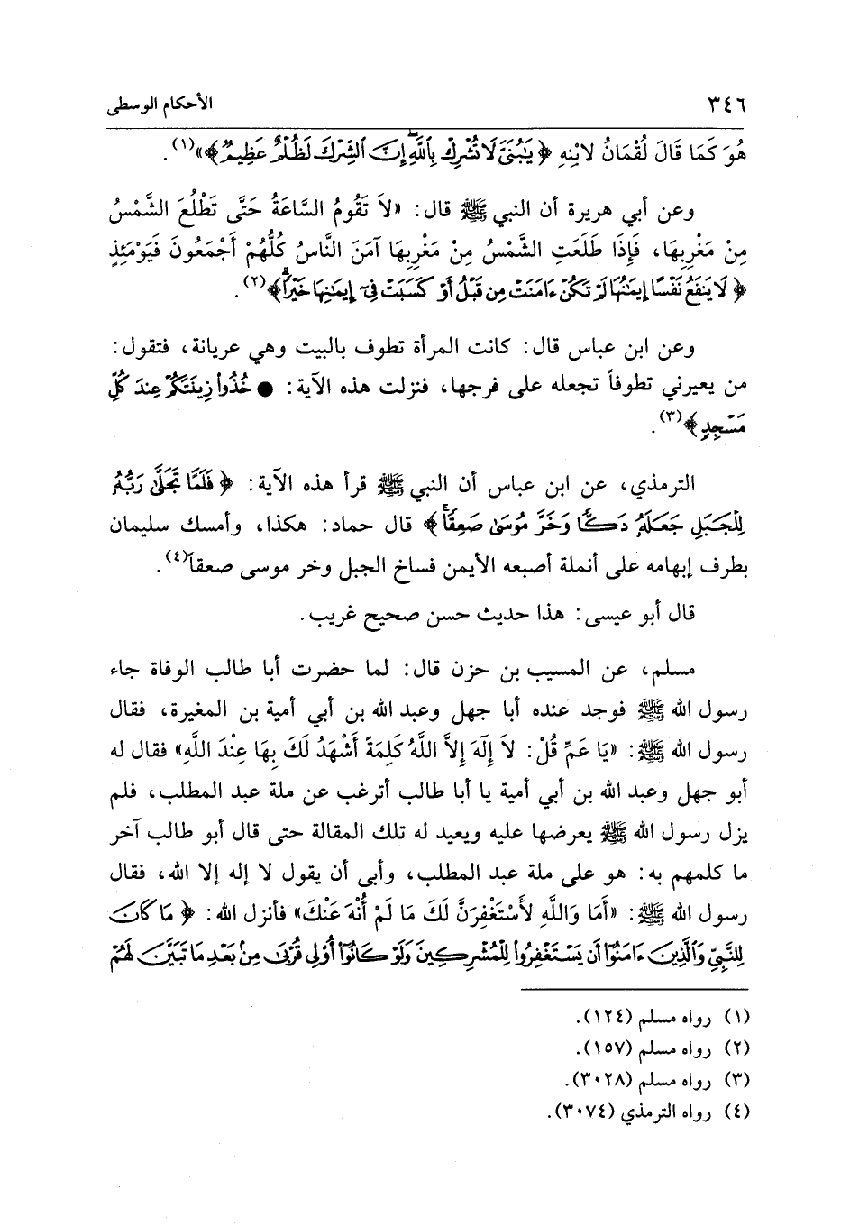 مسلم، عن المسيب بن حزن قال: لما حضرت أبا طالب الوفاة جاء رسول الله - صلى الله عليه وسلم - فوجد عنده أبا جهل وعبد الله بن أبي أمية بن المغيرة، فقال رسول الله - صلى الله عليه وسلم -: "يَا عَمِّ قُلْ: لاَ إِله إِلَّا اللهُ كَلِمَةَ أَشْهدُ لَكَ بِها عِنْدَ اللهِ" فقال له أبو جهل وعبد الله بن أبي أمية يا أبا طالب أترغب عن ملة عبد المطلب، فلم يزل رسول الله - صلى الله عليه وسلم - يعرضها عليه ويعيد له تلك المقالة حتى قال أبو طالب آخر ما كلمهم به: هو على ملة عبد المطلب، وأبى أن يقول لا إله إلا الله، فقال رسول الله - صلى الله عليه وسلم -: "أَمَا وَاللهِ لأَسْتَغْفِرَنَّ لَكَ مَا لَمْ أُنْة عَنْكَ" فأنزل الله: {مَا كَانَ لِلنَّبِيِّ وَالَّذِينَ آمَنُوا أَنْ يَسْتَغْفِرُوا لِلْمُشْرِكِينَ وَلَوْ كَانُوا أُولِي قُرْبَى مِنْ بَعْدِ مَا تَبَيَّنَ لَهُمْ