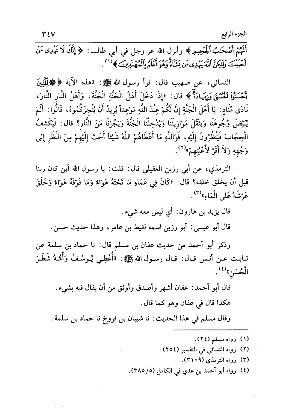 النسائي، عن صهيب قال: قرأ رسول الله - صلى الله عليه وسلم -: "هذه الآية {لِلَّذِينَ أَحْسَنُوا الْحُسْنَى وَزِيَادَةٌ} قال: "إِذَا دَخَلَ أَهْلُ الْجَنَّةِ الْجَنَّةَ، وَأَهْلُ النَّارِ النَّارَ، نَادَى مُنَادٍ: يَا أَهْلَ الْجَنَّةِ إِنَّ لَكُم عِنْدَ اللهِ مَوْعِدًا يُرِيدُ أَنْ يُنْجزَكُمُوهُ، قَالُوا: أَلَمْ يُبَيِّضْ وُجُوهنَا وَيثَقِّلْ مَوَازِينَنَا وَيُدخِلنا الْجَنَّةَ وَيَجُزنَا مَنَ الَنَّارِ؟ قال: فَيَكْشِفُ الْحِجَابَ فَيَنْظُرُونَ إِلَيْهِ، فَوَاللهِ مَا أَعْطَاهُمُ اللهُ شَيْئًا أَحَبَّ إِلَيْهِم مِنَ النَّظَرِ إِلى وَجْهِهِ وَلاَ أَقَرَّ لأَعْيُنِهِمْ" (¬2).