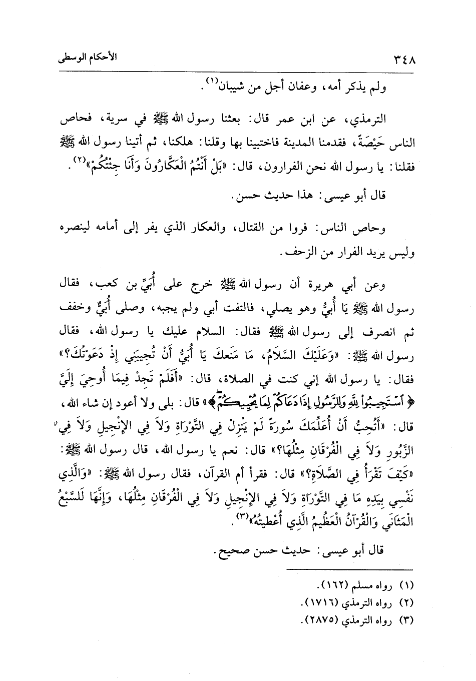 الترمذي، عن ابن عمر قال: بعثنا رسول الله - صلى الله عليه وسلم - في سرية، فحاص الناس حَيْصَةً، فقدمنا المدينة فاختبينا بها وقلنا: هلكنا، ثم أتينا رسول الله - صلى الله عليه وسلم - فقلنا: يا رسول الله نحن الفرارون، قال: "بَلْ أَنْتُمُ الْعَكَّارُونَ وَأَنَا جِئْتُكُمْ" (¬2).