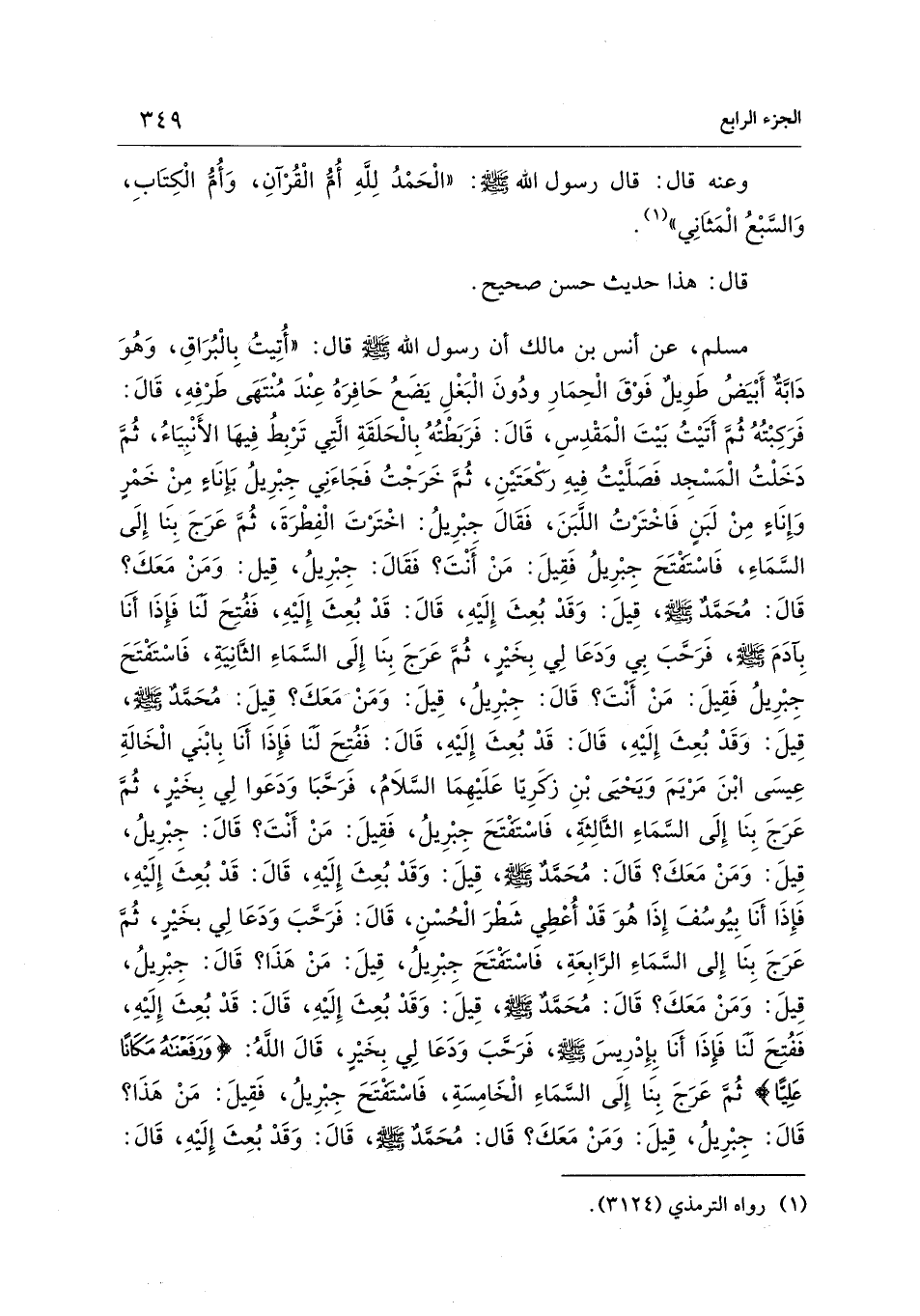 مسلم، عن أنس بن مالك أن رسول الله - صلى الله عليه وسلم - قال: "أُتِيتُ بِالْبُرَاقِ، وَهُوَ دَابَّةٌ أَبْيَضُ طَوِيلٌ فَوْقَ الْحِمَارِ ودُونَ الْبَغْلِ يَضَعُ حَافِرَهُ عِنْدَ مُنْتهى طَرفِهِ، قَالَ: فَرَكِبْتُهُ ثُمَّ أتَيْتُ بَيْتَ الْمَقْدِسِ، قَالَ: فَرَبَطْتُهُ بِالْحَلَقَةِ الَّتِي تَربِطُ فِيها الأَنْبِيَاءُ، ثُمَّ دَخَلْتُ الْمَسْجِد فَصَلَيْتُ فِيهِ ركْعَتَيْنِ، ثُمَّ خَرَجْتُ فَجَاءَنِي جِبْرِيلُ بَإِنَاءٍ مِنْ خمرٍ وَإِنَاءٍ مِنْ لَبَنٍ فَاخْتَرتُ اللَّبَنَ، فَقَالَ جبْرِيلُ: اخْترتَ الْفِطْرَةَ، ثُمَّ عَرَجَ بِنَا إِلَى السَّمَاءِ، فَاسْتفتَحَ جِبْرِيلُ فَقِيلَ: مَنْ أَنْتَ؟ فَقَالَ: جِبْرِيلُ، قِيلِ: وَمَنْ مَعَك؟ قَالَ: مُحمَدٌ - صلى الله عليه وسلم -، قِيلَ: وَقَد بُعِثَ إِلَيْهِ، قَالَ: قَدْ بُعِثَ إِلَيْهِ، ففُتِحَ لنا فَإِذَا أَنَا بِآدَمَ - صلى الله عليه وسلم -. فَرَحَّبَ بِي وَدَعَا لِي بِخَيْر، ثُمَّ عَرَجَ بِنَا إِلَى السَّمَاءِ الثَّانِيَةِ، فَاسْتفتَحَ جِبْرِيلُ فَقِيلَ: مَنْ أَنْتَ؟ قَالَ: جِبْرِيلُ، قِيلَ: وَمَنْ مَعَكَ؟ قِيلَ: مُحَمَدٌ - صلى الله عليه وسلم -، قِيلَ: وَقَد بُعِثَ إِلَيْهِ، قَالَ: قَدْ بُعِثَ إِلَيْهِ، قَالَ: فَفُتِحَ لَنَا فَإِذَا أَنا بِابْنَي الْخَالَةِ عِيسَى ابْنَ مَرْيَمَ وَيَحيَى بْنِ زكَرِيا عَلَيْهِمَا السَّلاَمُ، فَرَحَّبَا وَدَعَوا لِي بِخَيْر، ثُمَّ عَرَجَ بِنَا إِلَى السَّمَاءِ الثَّالِثَةِ، فَاسْتفتَحَ جِبْرِيلُ، فَقِيلَ: مَنْ أَنْتَ؟ قَالَ: جِبْرِيلُ، قِيلَ: وَمَنْ مَعَك؟ قَالَ: مُحمَّدٌ - صلى الله عليه وسلم -، قِيلَ: وَقَد بُعِثَ إِلَيْهِ، قَالَ: قَدْ بُعِثَ إِلَيْهِ، فَإِذَا أَنا بِيُوسُفَ إِذَا هُوَ قَدْ أُعطِي شَطْرَ الْحُسْنِ، قَالَ: فَرَحَّبَ وَدَعَا لِي بخَيْرٍ، ثُمَّ عَرَجَ بِنَا إِلى السَّمَاءِ الرَّابِعَةِ، فَاسْتفتَحَ جِبْرِيلُ، قِيلَ: مَنْ هذَا؟ قَالَ: جِبْرِيلُ، قِيلَ: وَمَنْ مَعَك؟ قَالَ: مُحمَّدٌ - صلى الله عليه وسلم -، قِيلَ: وَقَد بُعِثَ إِلَيْهِ، قَالَ: قَدْ بُعِثَ إِلَيْهِ، فَفُتِحَ لنا فإذَا أَنَا بِإدرِيسَ - صلى الله عليه وسلم -. فَرحَّبَ وَدَعَا لِي بِخَيْرٍ، قَالَ اللهُ: {وَرَفَعْنَاهُ مَكَانًا عَلِيًّا (57)} ثُمَّ عَرَجَ بِنَا إِلَى السَّمَاءِ الْخَامِسَةِ، فَاسْتَفْتَحَ جِبْرِيلُ، فَقِيلَ: مَنْ هذَا؟ قَالَ: جِبْرِيلُ، قِيلَ: وَمَنْ مَعَكَ؟ قَال: مُحَمَّدٌ - صلى الله عليه وسلم -، قَالَ: وَقَد بُعِثَ إِلَيْهِ، قَالَ:
