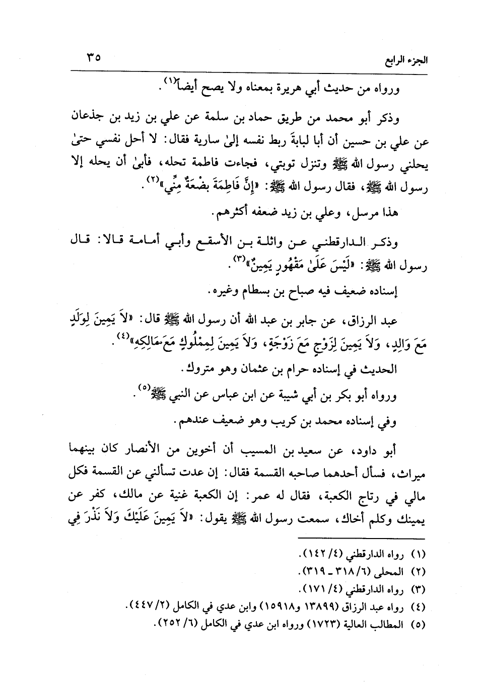 عبد الرزاق، عن جابر بن عبد الله أن رسول الله - صلى الله عليه وسلم - قال: "لاَ يَمِينَ لِوَلَدِ مَعَ وَالِدٍ، وَلاَ يَمِينَ لِزَوْجٍ مَعَ زَوْجَةٍ، وَلاَ يَمِينَ لِمملُوكٍ مَعَ مَالِكِهِ" (¬4).