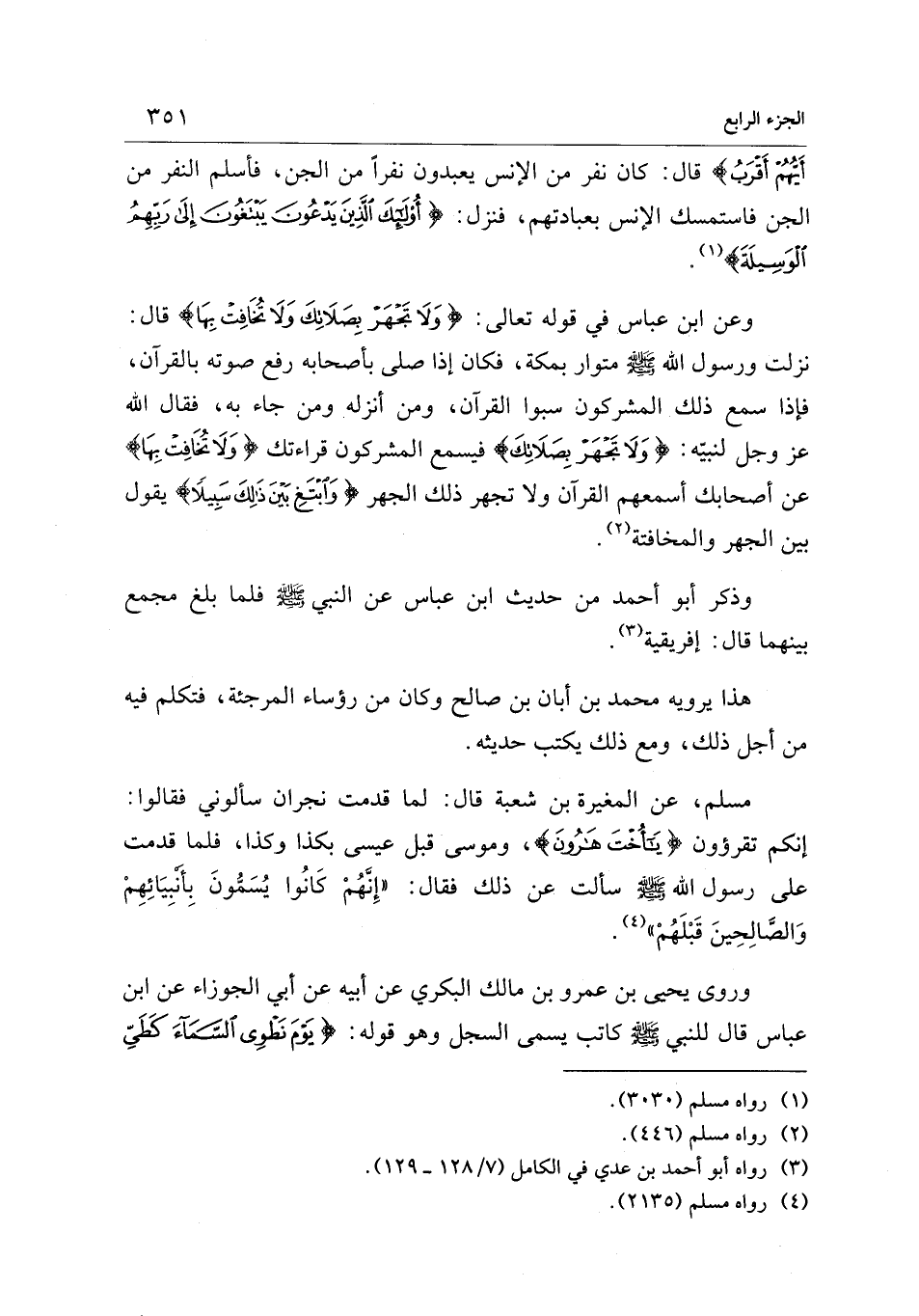 وعن ابن عباس في قوله تعالى: {وَلَا تَجْهَرْ بِصَلَاتِكَ وَلَا تُخَافِتْ بِهَا} قال: نزلت ورسول الله - صلى الله عليه وسلم - متوار بمكة، فكان إذا صلى بأصحابه رفع صوته بالقرآن، فإذا سمع ذلك المشركون سبوا القرآن، ومن أنزله ومن جاء به، فقال الله عز وجل لنبيّه: {وَلَا تَجْهَرْ بِصَلَاتِكَ} فيسمع المشركون قراءتك {وَلَا تُخَافِتْ بِهَا} عن أصحابك أسمعهم القرآن ولا تجهر ذلك الجهر {وَابْتَغِ بَيْنَ ذَلِكَ سَبِيلًا} يقول بين الجهر والمخافتة (¬2).