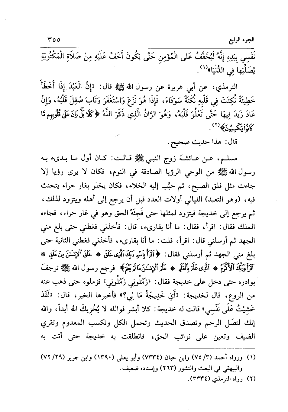 الترمذي، عن أبي هريرة عن رسول الله - صلى الله عليه وسلم - قال: "إِنَّ الْعَبْدَ إِذَا أَخْطَأَ خَطِيئَةً نُكِتَتْ فِي قَلْبِهِ نُكْتَةٌ سَوْدَاءَ، فَإِذَا هُوَ نَزَعَ وَاسْتَغْفَرَ وَتَابَ صُقِلَ قَلْبُهُ، وَإِنْ عَادَ زَيدَ فِيها حَتَّى تَعلُوَ قَلْبَهُ، وَهُوَ الرَّانُ الَّذِي ذَكَرَ اللهُ {كَلَّا بَلْ رَانَ عَلَى قُلُوبِهِمْ مَا كَانُوا يَكْسِبُونَ (14)} (¬2).
