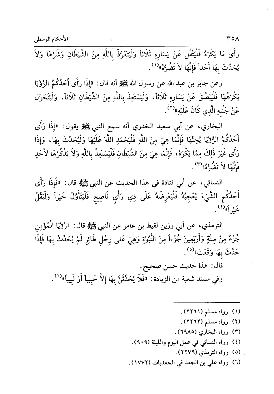 البخاري، عن أبي سعيد الخدري أنه سمع النبي - صلى الله عليه وسلم - يقول: "إِذَا رَأَى أَحَدُكُمُ الرُّؤْيَا يُحِبها فَإِنَّمَا هِيَ مِنَ اللهِ فَلْيحمَدِ الله عَلَيْها وَلْيُحَدِّثْ بِها، وَإِذَا رَأَى غَيْرَ ذَلِكَ مِمَّا يَكْرَهُ، فَإِنَّمَا هِيَ مِنَ الشَّيْطَانِ فَلْيَسْتَعِذْ باللهِ وَلاَ يَذْكُرها لأَحَدٍ فَإِنَّهَا لاَ تَضُرُّهُ" (¬3).
