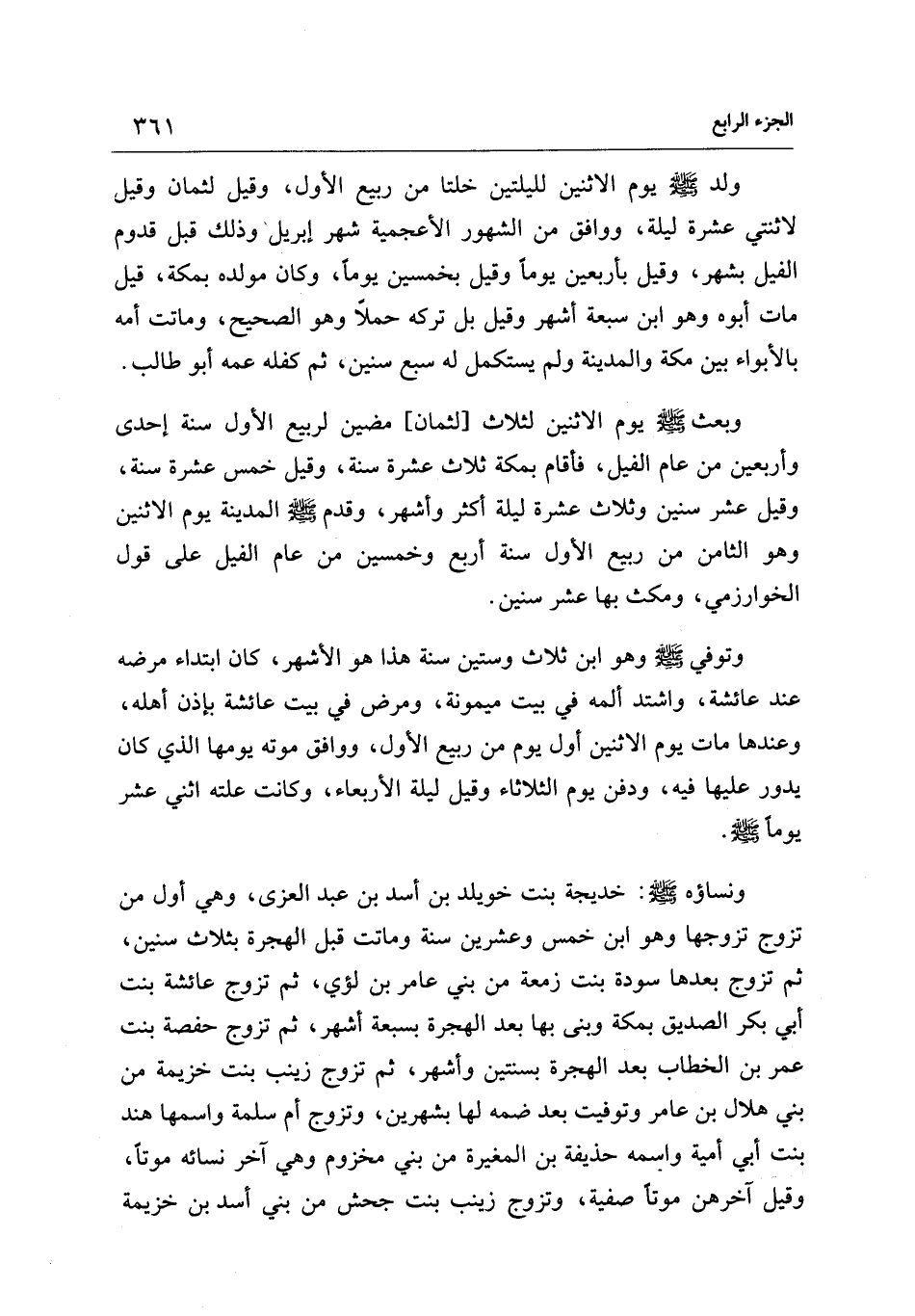 ونساؤه - صلى الله عليه وسلم -: خديجة بنت خويلد بن أسد بن عبد العزى، وهي أول من تزوج تزوجها وهو ابن خمس وعشرين سنة وماتت قبل الهجرة بثلاث سنين، ثم تزوج بعدها سودة بنت زمعة من بني عامر بن لؤي، ثم تزوج عائشة بنت أبي بكر الصديق بمكة وبنى بها بعد الهجرة بسبعة أشهر، ثم تزوج حفصة بنت عمر بن الخطاب بعد الهجرة بسنتين وأشهر، ثم تزوج زينب بنت خزيمة من بني هلال بن عامر وتوفيت بعد ضمه لها بشهرين، وتزوج أم سلمة واسمها هند بنت أبي أمية واسمه حذيفة بن المغيرة من بني مخزوم وهي آخر نسائه موتًا، وقيل آخرهن موتًا صفية، وتزوج زينب بنت جحش من بني أسد بن خزيمة