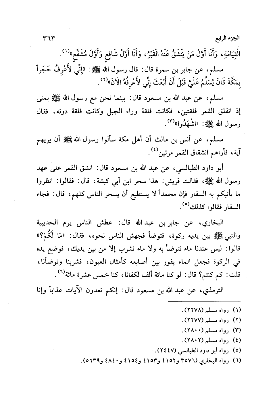 أبو داود الطيالسي، عن عبد الله بن مسعود قال: انشق القمر على عهد رسول الله - صلى الله عليه وسلم -. فقالت قريش: هذا سحر ابن أبي كبشة، قال: فقالوا: انظروا ما يأتيكم به السفار فإن محمدًا لا يستطيع أن يسحر الناس كلهم، قال: فجاء السفار فقالوا كذلك (¬5).