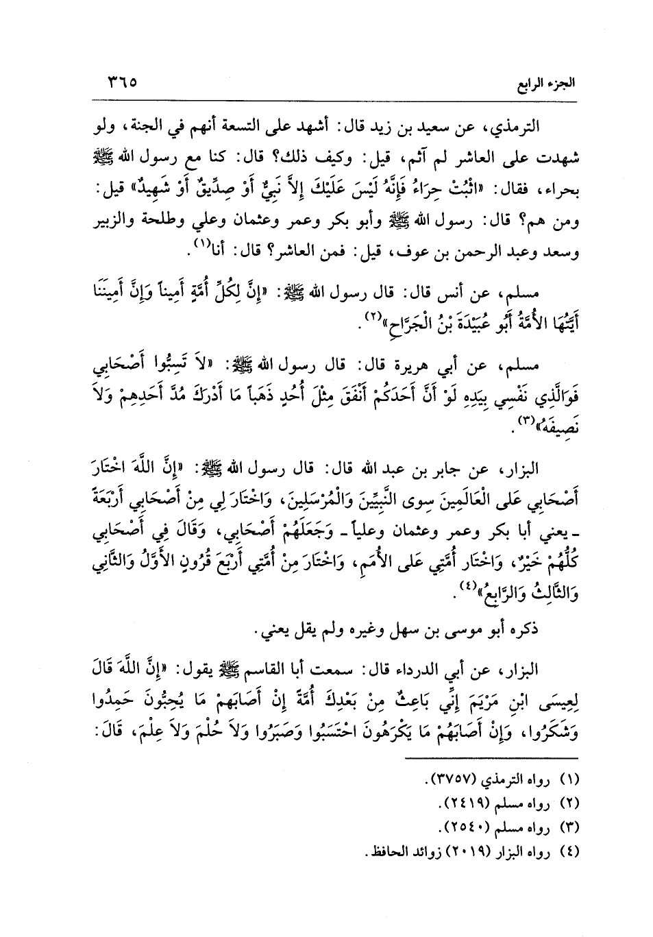 الترمذي، عن سعيد بن زيد قال: أشهد على التسعة أنهم في الجنة، ولو شهدت على العاشر لم آثم، قيل: وكيف ذلك؟ قال: كنا مع رسول الله - صلى الله عليه وسلم - بحراء، فقال: "اثْبُتْ حِرَاءُ فَإِنَّهُ لَيْسَ عَلَيْكَ إِلَّا نَبِيٌّ أَوْ صِدِّيقٌ أَوْ شَهِيدٌ" قيل: ومن هم؟ قال: رسول الله - صلى الله عليه وسلم - وأبو بكر وعمر وعثمان وعلي وطلحة والزبير وسعد وعبد الرحمن بن عوف، قيل: فمن العاشر؟ قال: أنا (¬1).